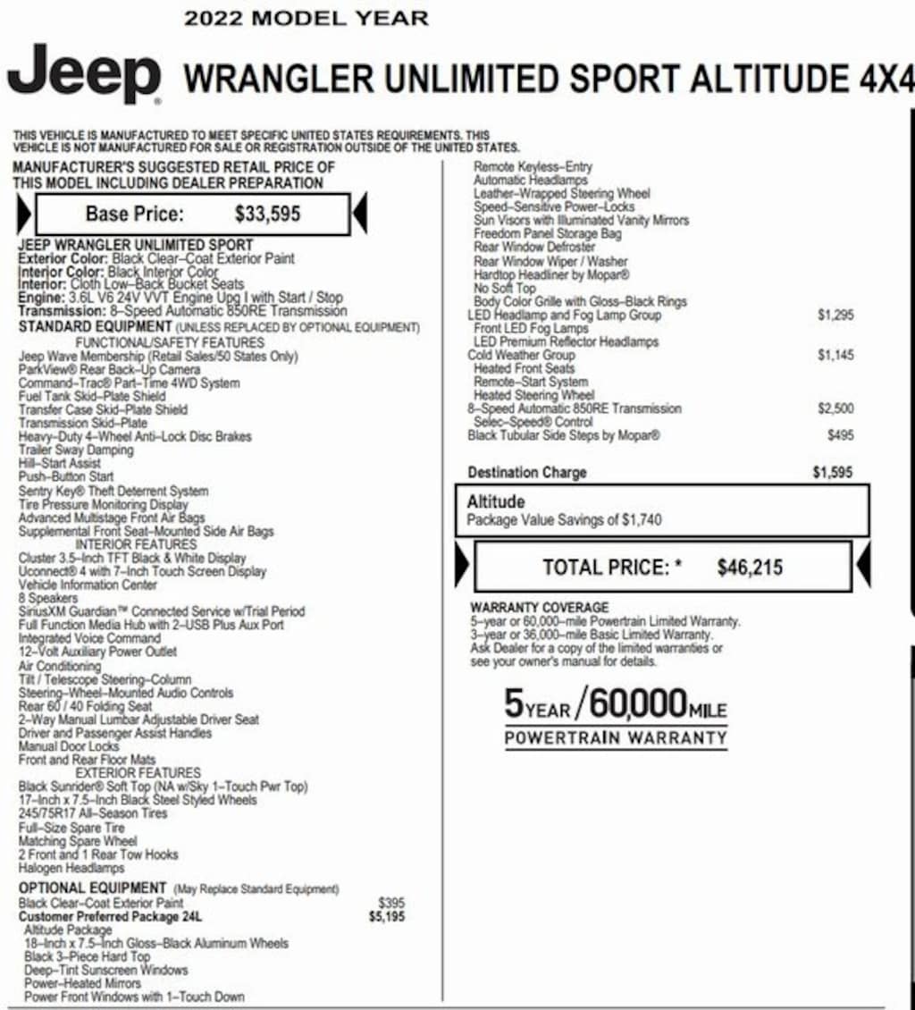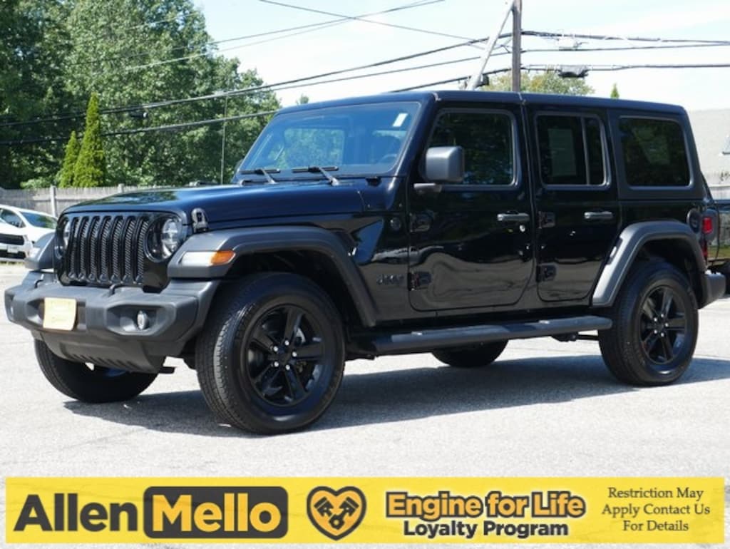 Allen Mello Chrysler Jeep Dodge Ram is proud to present you with another True Market Priced Pre-Owned Vehicle. This 2022 Jeep Wrangler Unlimited Sport Altitude FCA US LLC Certified Pre-Owned is loaded with the following Factory Options: Altitude Package, Cold Weather Group (Heated Front Seats, Heated Steering Wheel, and Leather Wrapped Steering Wheel), LED Headlamp & Fog Lamp Group (Front LED Fog Lamps and LED Premium Reflector Headlamps), Quick Order Package 24L Altitude (DISC) (110 MPH Vehicle Max Speed Calibration, Automatic Headlamps, Black 3-Piece Hard Top, Black Interior Accents, Black Trail Rated Badge, Body Color Grille w/Gloss Black Rings, Bridgestone Brand Tires, Deep Tint Sunscreen Windows, Freedom Panel Storage Bag, Front 1-Touch Down Power Windows, Heavy Duty Suspension w/Gas Shocks, Matte Black Jeep Badge, MOPAR Hardtop Headliner, No Soft Top, Power Heated Mirrors, Rear Window Defroster, Rear Window Wiper/Washer, Remote Keyless Entry, Security Alarm, Speed Sensitive Power Locks, Sun Visors w/Illuminated Vanity Mirrors, Wheels: 18" x 7.5" Gloss Black Aluminum, and Wizard Black Instrument Panel Bezels), and Body Color 3-Piece Hard Top Altitude Package, Cold Weather Group (Heated Front Seats, Heated Steering Wheel, and Leather Wrapped Steering Wheel), LED Headlamp & Fog Lamp Group (Front LED Fog Lamps and LED Premium Reflector Headlamps), Quick Order Package 24L Altitude (DISC) (110 MPH Vehicle Max Speed Calibration, Automatic Headlamps, Black 3-Piece Hard Top, Black Interior Accents, Black Trail Rated Badge, Body Color Grille w/Gloss Black Rings, Bridgestone Brand Tires, Deep Tint Sunscreen Windows, Freedom Panel Storage Bag, Front 1-Touch Down Power Windows, Heavy Duty Suspension w/Gas Shocks, Matte Black Jeep Badge, MOPAR Hardt