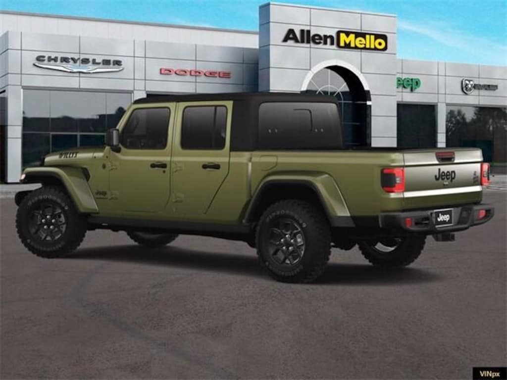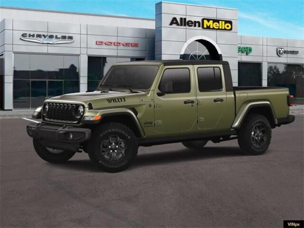 Allen Mello Chrysler Jeep Dodge Ram is proud to present you with another True Market Priced Vehicle. This 2025 Jeep Gladiator Willys is loaded with the following Factory Options: Convenience Group (Corning Gorilla Glass, Daytime Running Lamp System, Emergency/Assistance Call, Front Door Locks 2-Door Passive Entry, Heated Front Seats, Heated Steering Wheel, Remote Start System, and Universal Garage Door Opener), Quick Order Package 24W Willys (4-Wheel Drive Decal, Advanced Brake Assist, Air Conditioning w/Auto Temperature Control, Automatic Headlamps, Auxiliary Switches, Black Grille, Body Color Fender Flares (2-Piece), Class IV Receiver Hitch, Cluster 7.0" TFT Color Display, Daytime Running Lamps LED Accents, Deep Tint Sunscreen Windows, E-Locker Rear Axle, Enhanced Adaptive Cruise Control, Front Heavy Duty Red Accent Shock Absorbers, Front LED Fog Lamps, Full Speed Forward Collision Warning Plus, Heavy-Duty Engine Cooling, LED Premium Reflector Headlamps, LED Taillamps, Mold In Color Bumper w/Gloss Black, MOPAR All-Weather Slush Mats, Off-Road Plus Mode, Power Heated Mirrors, Premium Wrapped Steering Wheel, Protection Sill Rails, Rear Heavy Duty Red Accent Shock Absorbers, Security Alarm, Sun Visors w/Illuminated Vanity Mirrors, Trailer Hitch Zoom, Wheels: 17" x 7.5" Painted Black, Willys Hood Decal, and Willys Suspension), Technology Group (115V Auxiliary Power Outlet, 12.3" Touchscreen Display, 400W Inverter, 4G LTE Wi-Fi Hot Spot, Alexa Built-In, Apple CarPlay, Auto-Dimming Rear-View Mirror, Bluetooth Wireless Speaker, Connected Travel & Traffic Services, Connectivity - US/Canada, Google Android Auto, GPS Antenna Input, GPS Navigation, HD Radio, Integrated Center Stack Radio, Integrated Voice Command w/Bluetooth, Media Hub w/2 Charge Only USBs, Radio: Uconnect 5 Nav w/12.3" Display, SiriusXM Radio Service, SiriusXM w/360L, and USB Host Flip), 110 MPH Vehicle Max Speed Calibration, 3.73 Rear Axle Ratio, 4-Wheel Disc Brakes, 8 Speakers, ABS brakes, Air Conditioning, Alpine Premium Audio System, AM/FM radio: SiriusXM, Apple CarPlay/Android Auto, Black 3-Piece Hard Top, Brake assist, Cloth Low-Back Bucket Seats, Compass, Delay-off headlights, Driver door bin, Driver vanity mirror, Dual front impact airbags, Dual front side impact airbags, Electronic Stability Control, Freedom Panel Storage Bag, Front anti-roll bar, Front Bucket Seats, Front Center Armrest w/Storage, Front fog lights, Front License Plate Bracket, Front reading lights, Illuminated entry, Integrated roll-over protection, Low tire pressure warning, MOPAR Hardtop Headliner, MOPAR Multi-Function Accessory Rail, MOPAR Plastic Door Sill Guards, MOPAR Spray In Bedliner, Normal Duty Suspension, Occupant sensing airbag, Outside temperature display, Overhead airbag, Panic alarm, ParkView Rear Back-Up Camera, Passenger door bin, Passenger vanity mirror, Power steering, Power windows, Radio data system, Radio: Uconnect 5 w/12.3" Display, Rear anti-roll bar, Rear reading lights, Rear Sliding Window, Rear Window Defroster, Remote keyless entry, Speed control, Split folding rear seat, Steering wheel mounted audio controls, T Discount includes a $1,000 Hospital, Military, Firefighters, Police or School Employees must show proof of employment. Price does not include tax, title, license, and document fees. Not all customers qualify for all rebates. Contact us for more information. Price includes: $2250 - 2025 N