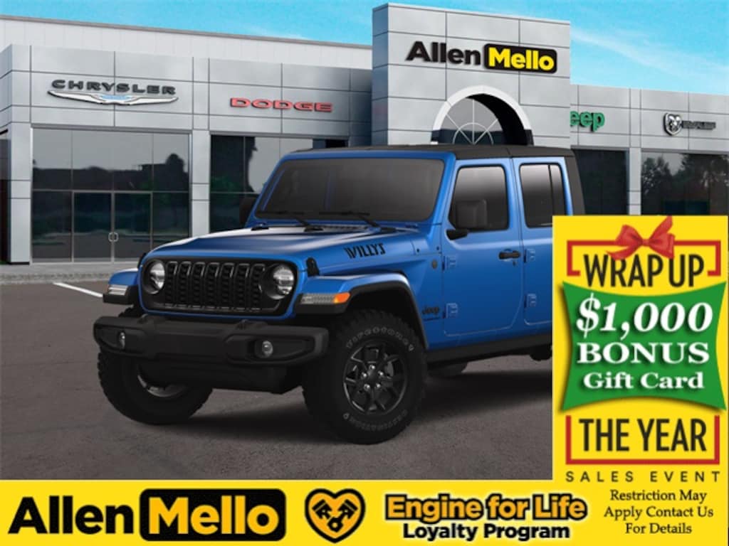 Allen Mello Chrysler Jeep Dodge Ram is proud to present you with another True Market Priced Vehicle. This 2025 Jeep Gladiator Willys is loaded with the following Factory Options: Convenience Group (Corning Gorilla Glass, Daytime Running Lamp System, Emergency/Assistance Call, Front Door Locks 2-Door Passive Entry, Heated Front Seats, Heated Steering Wheel, Remote Start System, and Universal Garage Door Opener), Quick Order Package 24W Willys (4-Wheel Drive Decal, Advanced Brake Assist, Air Conditioning w/Auto Temperature Control, Automatic Headlamps, Auxiliary Switches, Black Grille, Body Color Fender Flares (2-Piece), Class IV Receiver Hitch, Cluster 7.0" TFT Color Display, Daytime Running Lamps LED Accents, Deep Tint Sunscreen Windows, E-Locker Rear Axle, Enhanced Adaptive Cruise Control, Front Heavy Duty Red Accent Shock Absorbers, Front LED Fog Lamps, Full Speed Forward Collision Warning Plus, Heavy-Duty Engine Cooling, LED Premium Reflector Headlamps, LED Taillamps, Mold In Color Bumper w/Gloss Black, MOPAR All-Weather Slush Mats, Off-Road Plus Mode, Power Heated Mirrors, Premium Wrapped Steering Wheel, Protection Sill Rails, Rear Heavy Duty Red Accent Shock Absorbers, Security Alarm, Sun Visors w/Illuminated Vanity Mirrors, Trailer Hitch Zoom, Wheels: 17" x 7.5" Painted Black, Willys Hood Decal, and Willys Suspension), 110 MPH Vehicle Max Speed Calibration, 12.3" Touchscreen Display, 3.73 Rear Axle Ratio, 4-Wheel Disc Brakes, 4G LTE Wi-Fi Hot Spot, 8 Speakers, ABS brakes, Air Conditioning, Alexa Built-In, AM/FM radio: SiriusXM, Apple CarPlay, Apple CarPlay/Android Auto, Black 3-Piece Hard Top, Brake assist, Cloth Low-Back Bucket Seats, Compass, Connectivity - US/Canada, Delay-off headlights, Driver door bin, Driver vanity mirror, Dual front impact airbags, Dual front side impact airbags, Electronic Stability Control, Freedom Panel Storage Bag, Front anti-roll bar, Front Bucket Seats, Front Center Armrest w/Storage, Front fog lights, Front License Plate Bracket, Front reading lights, Google Android Auto, Illuminated entry, Integrated roll-over protection, Low tire pressure warning, Normal Duty Suspension, Occupant sensing airbag, Outside temperature display, Overhead airbag, Panic alarm, ParkView Rear Back-Up Camera, Passenger door bin, Passenger vanity mirror, Power steering, Power windows, Radio data system, Radio: Uconnect 5 w/12.3" Display, Rear anti-roll bar, Rear reading lights, Rear Sliding Window, Rear Window Defroster, Remote keyless entry, Speed control, Split folding rear seat, Steering wheel mounted audio controls, Tachometer, Telescoping steering wheel, Tilt steering wheel, Traction control, Trip computer, USB Host Flip, Variably intermittent wipers, Voltmeter, and Wheels: 17" x 7.5" Black Steel Styled!! Discount includes a $1,000 Hospital, Military, Firefighters, Police or School Employees must show proof of employment. Price does not include tax, title, license, and document fees. Not all customers qualify for all rebates. Contact us for more information. Price includes: $2250 - 2025 National Bonus Cash . Exp. 01/05/2026