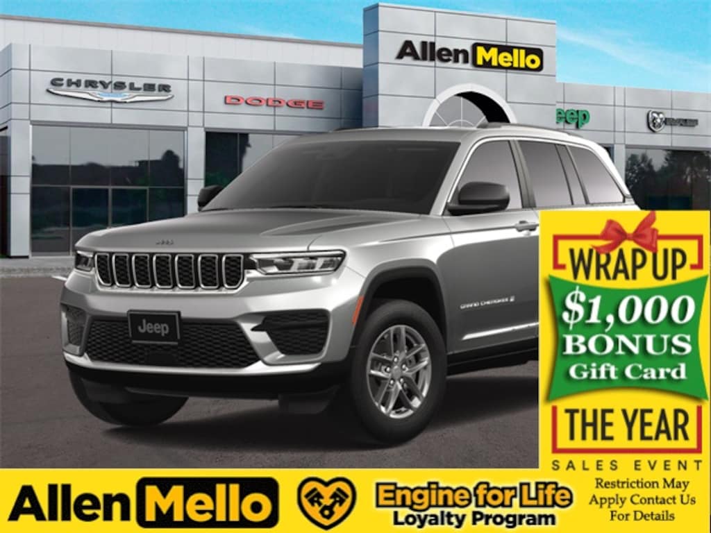 Allen Mello Chrysler Jeep Dodge Ram is proud to present you with another True Market Priced Vehicle. This 2025 Jeep Grand Cherokee Laredo X is loaded with the following Factory Options: 4WD, ABS brakes, Alloy wheels, Compass, Electronic Stability Control, Emergency communication system, Front dual zone A/C, Heated door mirrors, Illuminated entry, Low tire pressure warning, ParkView Rear Back-Up Camera, Remote keyless entry, and Traction control 4WD, ABS brakes, Alloy wheels, Compass, Electronic Stability Control, Emergency communication system, Front dual zone A/C, Heated door mirrors, Illuminated entry, Low tire pressure warning, ParkView Rear Back-Up Camera, Remote keyless entry, Traction control, 4-Wheel Disc Brakes, 6 Speakers, Air Conditioning, AM/FM radio: SiriusXM, Anti-whiplash front head restraints, Automatic temperature control, Brake assist, Bumpers: body-color, Cloth Seats, Delay-off headlights, Driver door bin, Driver vanity mirror, Dual front impact airbags, Dual front side impact airbags, Four wheel independent suspension, Front anti-roll bar, Front Bucket Seats, Front Center Armrest w/Storage, Front reading lights, Fully automatic headlights, Knee airbag, Normal Duty Suspension, Occupant sensing airbag, Outside temperature display, Overhead airbag, Overhead console, Panic alarm, Passenger door bin, Passenger vanity mirror, Power door mirrors, Power driver seat, Power steering, Power windows, Radio data system, Rear anti-roll bar, Rear reading lights, Rear window defroster, Rear window wiper, Security system, Speed control, Speed-Sensitive Wipers, Split folding rear seat, Spoiler, Steering wheel mounted audio controls, Tachometer, Telescoping steering wheel, Tilt steering wheel, Trip computer, Variably intermittent wipers, Voltmeter, and Wheels: 17" x 6.5" Fully Painted Aluminum!! Discount includes a $1,000 Hospital, Military, Firefighters, Police or School Employees must show proof of employment. Price does not include tax, title, license, and document fees. Not all customers qualify for all rebates. Contact us for more information. Price includes: $2000 - 2025 National Holiday Select Inventory Bonus Cash. Exp. 01/05/2026 $2250 - 2025 National Retail Bonus Cash . Exp. 01/05/2026