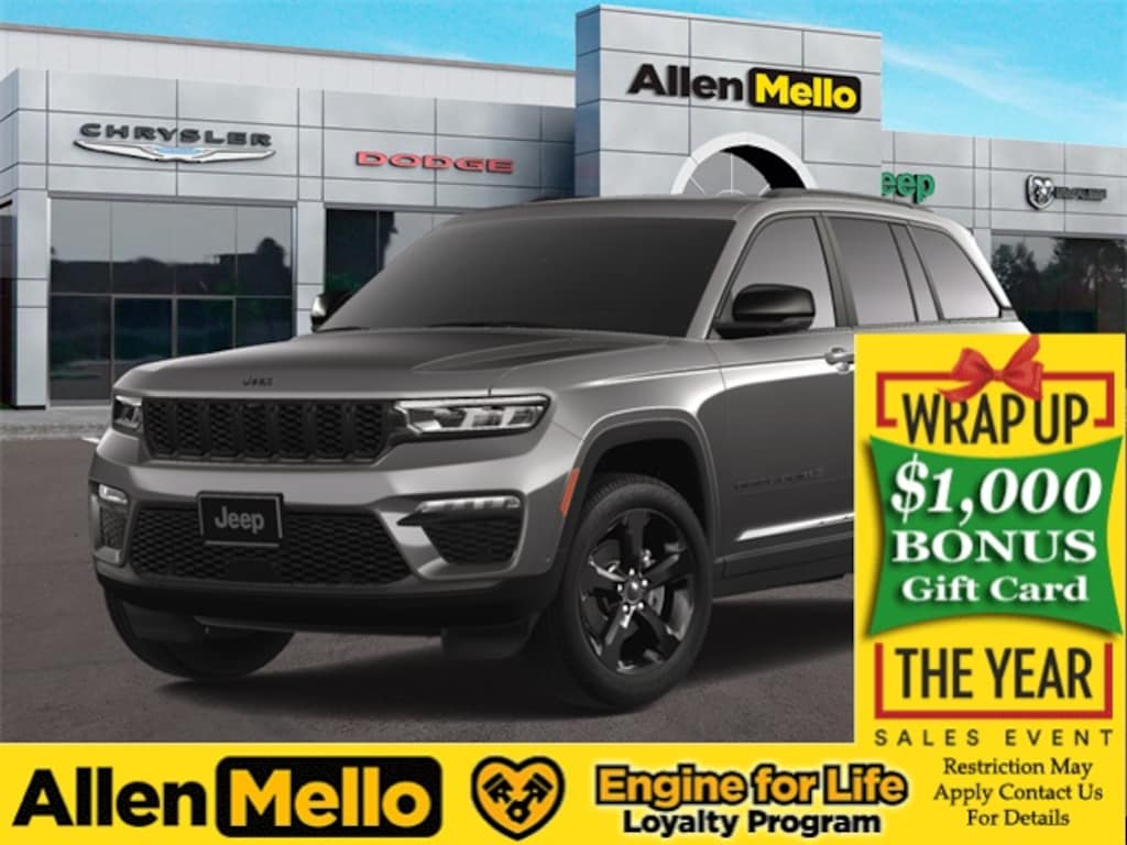 Allen Mello Chrysler Jeep Dodge Ram is proud to present you with another True Market Priced Vehicle. This 2025 Jeep Grand Cherokee Limited is loaded with the following Factory Options: 4WD Black Appearance Package (Gloss Black Exterior Accents and Wheels: 20" x 8.5" Gloss Black Painted Aluminum), Luxury Tech Group II (2nd-Row Manual Window Shades, Auto-Dimming Exterior Driver Mirror, Capri Leatherette with Axis II Seats, Front/Rear Doors and Liftgate with Passive Entry, Integrated Off-Road Camera, Intersection Collision Assist System, Memory Steering Column, ParkSense Front/Rear Park Assist with Stop, Power Tilt/Telescope Steering Column, Rain Sensitive Windshield Wipers, Rear Back-Up Camera Washer, Rearview Autodim Digital Display Mirror, Surround View Camera System, Ventilated Front Seats, and Wireless Charging Pad), Quick Order Package 22E, 4WD, 4-Wheel Disc Brakes, 6 Speakers, ABS brakes, Active Noise Control System, Air Conditioning, Alloy wheels, AM/FM radio: SiriusXM with 360L, Anti-whiplash front head restraints, Audio memory, Auto High-beam Headlights, Automatic temperature control, Brake assist, Bumpers: body-color, Capri Leatherette Seats, Compass, Delay-off headlights, Driver door bin, Driver vanity mirror, Dual front impact airbags, Dual front side impact airbags, Dual-Pane Panoramic Sunroof, Electronic Stability Control, Emergency communication system, Four wheel independent suspension, Front anti-roll bar, Front Bucket Seats, Front Center Armrest w/Storage, Front dual zone A/C, Front fog lights, Front License Plate Bracket, Front reading lights, Fully automatic headlights, Garage door transmitter, Heated door mirrors, Heated front seats, Heated rear seats, Heated steering wheel, Illuminated entry, Knee airbag, Low tire pressure warning, Memory seat, Model Year Tracking, Navigation System, Normal Duty Suspension, Occupant sensing airbag, Outside temperature display, Overhead airbag, Overhead console, Panic alarm, ParkView Rear Back-Up Camera, Passenger door bin, Passenger vanity mirror, Power door mirrors, Power driver seat, Power Liftgate, Power passenger seat, Power steering, Power windows, Radio data system, Radio: Uconnect 5 Nav with 10.1" Display, Rear anti-roll bar, Rear reading lights, Rear window defroster, Rear window wiper, Remote keyless entry, Security system, Speed control, Speed-Sensitive Wipers, Split folding rear seat, Spoiler, Steering wheel mounted audio controls, Tachometer, Telescoping steering wheel, Tilt steering wheel, Traction control, Trip computer, Turn signal indicator mirrors, Variably intermittent wipers, Voltmeter, and Wheels: 18" x 8" Polished/Painted Aluminum!! Discount includes a $1,000 Hospital, Military, Firefighters, Police or School Employees must show proof of employment. Price does not include tax, title, license, and document fees. Not all customers qualify for all rebates. Contact us for more information. Price includes: $2250 - 2025 National Retail Bonus Cash . Exp. 01/05/2026
