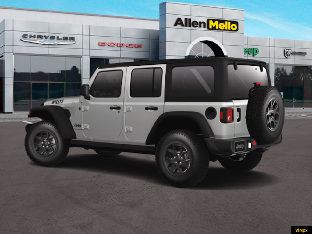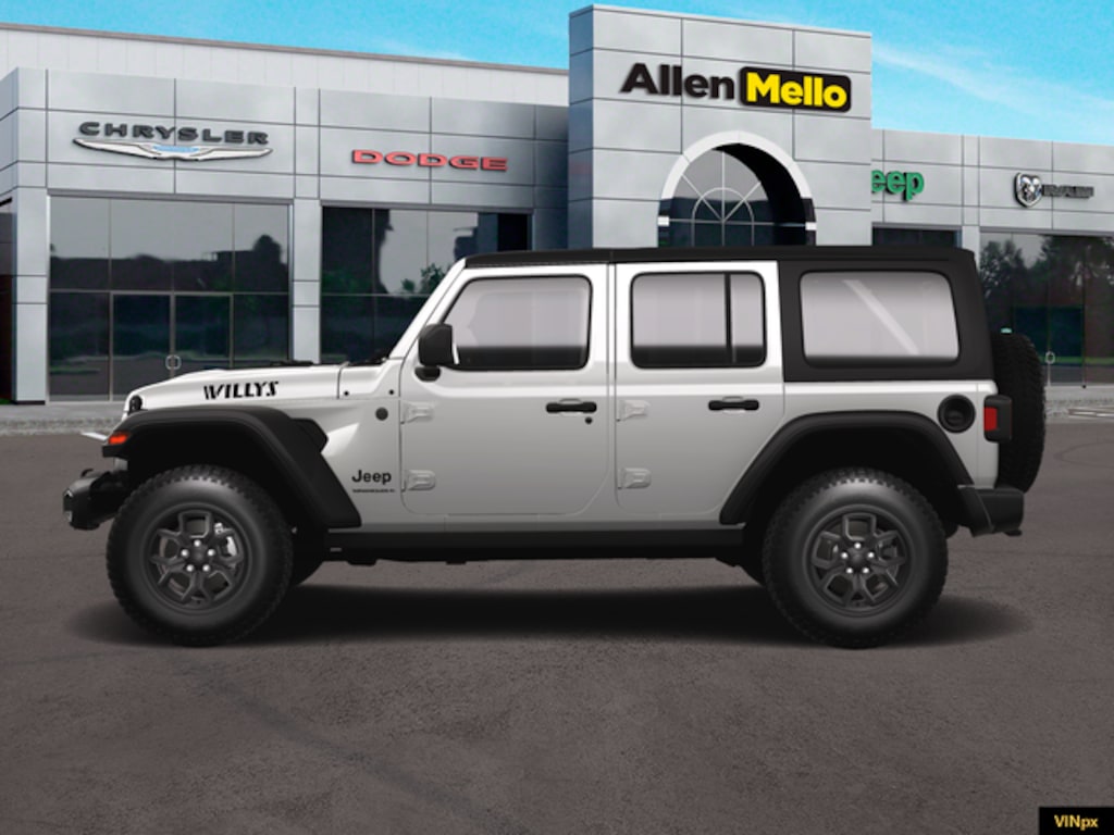 Allen Mello Chrysler Jeep Dodge Ram is proud to present you with another True Market Priced Vehicle. This 2025 Jeep Wrangler Willys is loaded with the following Factory Options: Convenience Group (2-Door Passive Entry, Front Door Locks, Air Conditioning w/Auto Temperature Control, Air Filtering, Cluster 7.0" TFT Color Display, Emergency/Assistance Call, Heated Front Seats, Heated Steering Wheel, Remote Start System, and Universal Garage Door Opener), Quick Order Package 24W Willys (4-Wheel Drive Swing Gate Decal, 7 & 4 Pin Wiring Harness, 97 MPH Vehicle Max Speed Calibration, Advanced Brake Assist, Automatic Headlamps, Auxiliary Switches, Black Grille, Class II Receiver Hitch, Conventional Differential Front Axle, Corning Gorilla Glass, Dana M210 Wide HD Tube Front Axle, Dana M220 Wide Rear Axle, Daytime Running Lamps LED Accents, Deep Tint Sunscreen Windows, E-Locker Rear Axle, Enhanced Adaptive Cruise Control, Front LED Fog Lamps, Full Speed Forward Collision Warning Plus, Injection Molded Black Rear Bumper, LED Premium Reflector Headlamps, Mold In Color Bumper w/Gloss Black, Molded in Color Rubicon Highline Flare, MOPAR All-Weather Floor Mats, Off-Road Plus Mode, Power Heated Mirrors, Premium Wrapped Steering Wheel, Security Alarm, Sun Visors w/Illuminated Vanity Mirrors, Wheels: 17" x 7.5" Painted Black, Willy's Suspension, and Willys Hood Decal), 110 MPH Vehicle Max Speed Calibration, 4-Wheel Disc Brakes, 8 Speakers, ABS brakes, Air Conditioning, AM/FM radio: SiriusXM, Apple CarPlay/Android Auto, Aux Battery, Black 3-Piece Hard Top, Brake assist, Cloth Low-Back Bucket Seats, Compass, Delay-off headlights, Driver door bin, Driver vanity mirror, Dual front impact airbags, Dual front side impact airbags, Electronic Stability Control, Freedom Panel Storage Bag, Front anti-roll bar, Front Bucket Seats, Front Center Armrest w/Storage, Front fog lights, Front reading lights, Illuminated entry, Integrated roll-over protection, Low tire pressure warning, Non-Lock Fuel Cap w/o Discriminator, Normal Duty Suspension, Occupant sensing airbag, Outside temperature display, Overhead airbag, Panic alarm, ParkView Rear Back-Up Camera, Passenger door bin, Passenger vanity mirror, Power steering, Power windows, Radio data system, Radio: Uconnect 5 w/12.3" Display, Rear anti-roll bar, Rear reading lights, Rear Window Defroster, Rear Window Wiper/Washer, Remote keyless entry, Speed control, Split folding rear seat, Steering wheel mounted audio controls, Stop-Start Dual Battery System, Tachometer, Telescoping steering wheel, Tilt steering wheel, Traction control, Trip computer, Variably intermittent wipers, and Wheels: 17" x 7.5" Black Steel Styled!! Discount includes a $1,000 Hospital, Military, Firefighters, Police or School Employees must show proof of employment. Price does not include tax, title, license, and document fees. Not all customers qualify for all rebates. Contact us for more information. Price includes: $2500 - 2025 National Retail Bonus Cash . Exp. 03/31/2026 $3500 - 2025 National Bonus Cash . Exp. 03/31/2026