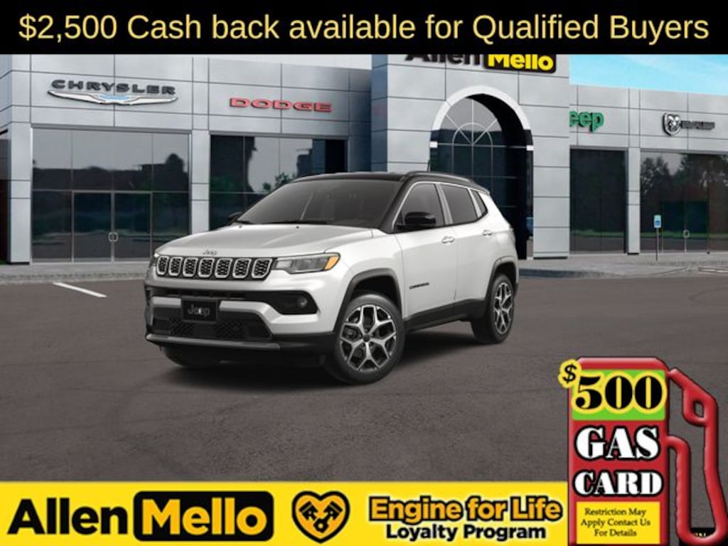 Allen Mello Chrysler Jeep Dodge Ram is proud to present you with another True Market Priced Vehicle. This 2026 Jeep Compass Limited is loaded with the following Factory Options: 4WD Quick Order Package 29G Limited, 4WD, 10.1" Touchscreen Display, 3.73 Final Drive Ratio, 4-Wheel Disc Brakes, 4G LTE Wi-Fi Hot Spot, 6 Speakers, ABS brakes, Air Conditioning, Alloy wheels, AM/FM radio: SiriusXM, Auto High-beam Headlights, Auto-dimming Rear-View mirror, Automatic temperature control, Brake assist, Bumpers: body-color, Compass, Delay-off headlights, Driver door bin, Driver vanity mirror, Dual front impact airbags, Dual front side impact airbags, Electronic Stability Control, Emergency communication system: SiriusXM Guardian, Four wheel independent suspension, Front anti-roll bar, Front Bucket Seats, Front Center Armrest w/Storage, Front dual zone A/C, Front fog lights, Front License Plate Bracket, Front reading lights, Fully automatic headlights, Global Telematics Box Module, Heated door mirrors, Heated front seats, Heated steering wheel, Illuminated entry, Knee airbag, Leather Shift Knob, Leather steering wheel, Leatherette Seats, Low tire pressure warning, Occupant sensing airbag, Outside temperature display, Overhead airbag, Overhead console, Panic alarm, ParkView Rear Back-Up Camera, Passenger door bin, Passenger vanity mirror, Power door mirrors, Power driver seat, Power Liftgate, Power steering, Power windows, Premium audio system: UConnect 5, Radio: Uconnect 5 with 10.1" Display, Rain sensing wipers, Rear anti-roll bar, Rear seat center armrest, Rear window defroster, Rear window wiper, Remote keyless entry, Security system, SiriusXM Guardian - Included Trail (B), SiriusXM Radio Service, Speed control, Split folding rear seat, Spoiler, Steering wheel mounted audio controls, Tachometer, Telescoping steering wheel, Tilt steering wheel, Traction control, Trip computer, Turn signal indicator mirrors, Variably intermittent wipers, and Wheels: 18" x 7" Painted Diamond Cut Aluminum!! Discount includes a $1,000 Hospital, Military, Firefighters, Police or School Employees must show proof of employment. Price does not include tax, title, license, and document fees. Not all customers qualify for all rebates. Contact us for more information. Price includes: $1000 - 2026 National Retail Bonus Cash . Exp. 04/30/2026 $1500 - 2026 Northeast BC Retail Bonus Cash . Exp. 04/30/2026
