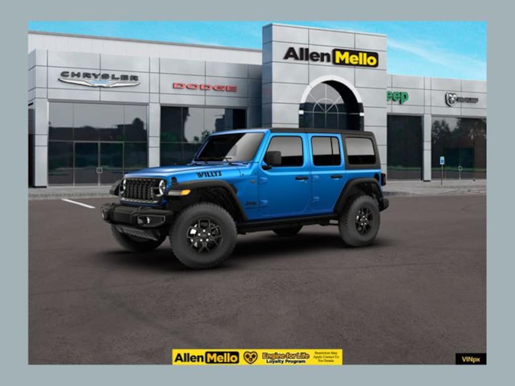 Allen Mello Chrysler Jeep Dodge Ram is proud to present you with another True Market Priced Vehicle. This 2026 Jeep Wrangler Willys is loaded with the following Factory Options: Convenience Group (2-Door Passive Entry, Front Door Locks, Air Conditioning with Auto Temp Control, Air Filtering, Cluster 7.0" TFT Color Display, Emergency/Assistance Call, Heated Front Seats, Heated Steering Wheel, and Universal Garage Door Opener), Quick Order Package 22W Willys (4-Wheel Drive Swing Gate Decal, 7 and 4 Pin Wiring Harness, Advanced Brake Assist, Automatic Headlamps, Auxiliary Switches, Black Grille with Gloss Black Rings, Class II Receiver Hitch, Conventional Differential Front Axle, Corning Gorilla Glass, Dana M210 Wide HD Tube Front Axle, Dana M220 Wide Rear Axle, Daytime Running Lamps LED Accents, Deep Tint Sunscreen Windows, E-Locker Rear Axle, Enhanced Adaptive Cruise Control, Front LED Fog Lamps, Full Speed Forward Collision Warning Plus, Increased Travel Export Tuned Suspension, Injection Molded Black Rear Bumper, LED Premium Reflector Headlamps, Mold in Color Bumper with Gloss Black, Molded in Color Rubicon Highline Flare, MOPAR All-Weather Floor Mats, Off-Road Plus Mode, Power Heated Mirrors, Premium Wrapped Steering Wheel, Security Alarm, Sun Visors with Illuminated Vanity Mirrors, Wheels: 17" x 7.5" Painted Black, and Willys Hood Decal), Safety Group (Auto High Beam Headlamp Control, Blind Spot and Cross Path Detection, LED Taillamps, and ParkSense Rear Park Assist System), 12.3" Touchscreen Display, 4-Wheel Disc Brakes, 4G LTE Wi-Fi Hot Spot, 8 Speakers, ABS brakes, Air Conditioning, AM/FM radio: SiriusXM with 360L, Apple CarPlay, Apple CarPlay/Android Auto, Aux Battery, Black 3-Piece Hard Top, Brake assist, Compass, Connectivity - US/Canada, Delay-off headlights, Driver door bin, Driver vanity mirror, Dual front impact airbags, Dual front side impact airbags, Electronic Stability Control, For More Info, Call 800-643-2112, Freedom Panel Storage Bag, Front anti-roll bar, Front Bucket Seats, Front Center Armrest w/Storage, Front fog lights, Front reading lights, Google Android Auto, Illuminated entry, Integrated Center Stack Radio, Integrated roll-over protection, Low tire pressure warning, Myflexcare Service Plan, No Soft Top, Non-Lock Fuel Cap Without Discriminator, Normal Duty Suspension, Occupant sensing airbag, Outside temperature display, Overhead airbag, Panic alarm, ParkView Rear Back-Up Camera, Passenger door bin, Passenger vanity mirror, Power steering, Power windows, Radio data system, Radio: Uconnect 5 with 12.3" Display, Rear anti-roll bar, Rear reading lights, Rear Window Defroster, Rear Window Wiper/Washer, Remote keyless entry, SiriusXM Radio Service, SiriusXM with 360L, Speed control, Split folding rear seat, Steering wheel mounted audio controls, Stop-Start Dual Battery System, Tachometer, Telescoping steering wheel, Tilt steering wheel, Traction control, Trip computer, Variably intermittent wipers, and Wheels: 17" x 7.5" Black Steel Styled!! Discount includes a $1,000 Hospital, Military, Firefighters, Police or School Employees must show proof of employment. Price does not include tax, title, license, and document fees. Not all customers qualify for all rebates. Contact us for more information. Price includes: $1000 - 2026 National Retail Bonus Cash . Exp. 04/30/2026 $1500 - 2026 National Select Inv