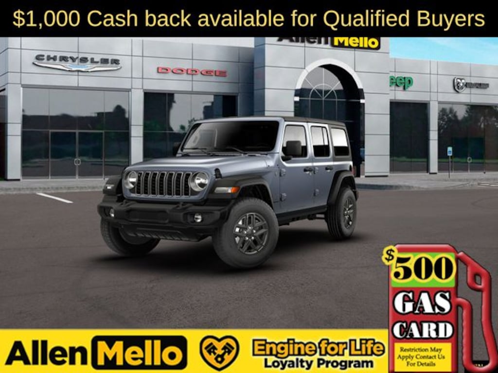 Allen Mello Chrysler Jeep Dodge Ram is proud to present you with another True Market Priced Vehicle. This 2026 Jeep Wrangler Sport S is loaded with the following Factory Options: Convenience Group (2-Door Passive Entry, Front Door Locks, Air Conditioning with Auto Temp Control, Air Filtering, Cluster 7.0" TFT Color Display, Emergency/Assistance Call, Heated Front Seats, Heated Steering Wheel, and Universal Garage Door Opener), Quick Order Package 24S Sport S (Advanced Brake Assist, Automatic Headlamps, Corning Gorilla Glass, Deep Tint Sunscreen Windows, Enhanced Adaptive Cruise Control, Full Speed Forward Collision Warning Plus, Power Heated Mirrors, Premium Wrapped Steering Wheel, Security Alarm, Sun Visors with Illuminated Vanity Mirrors, and Wheels: 17" x 7.5" Gray), 12.3" Touchscreen Display, 3.45 Overall Top Gear Ratio, 4-Wheel Disc Brakes, 4G LTE Wi-Fi Hot Spot, 8 Speakers, ABS brakes, Air Conditioning, AM/FM radio: SiriusXM with 360L, Apple CarPlay, Apple CarPlay/Android Auto, Aux Battery, Black 3-Piece Hard Top, Brake assist, Compass, Connectivity - US/Canada, Delay-off headlights, Driver door bin, Driver vanity mirror, Dual front impact airbags, Dual front side impact airbags, Electronic Stability Control, For More Info, Call 800-643-2112, Freedom Panel Storage Bag, Front anti-roll bar, Front Bucket Seats, Front Center Armrest w/Storage, Front fog lights, Front reading lights, Google Android Auto, Illuminated entry, Integrated Center Stack Radio, Integrated roll-over protection, Low tire pressure warning, No Soft Top, Non-Lock Fuel Cap Without Discriminator, Normal Duty Suspension, Occupant sensing airbag, Outside temperature display, Overhead airbag, Panic alarm, ParkView Rear Back-Up Camera, Passenger door bin, Passenger vanity mirror, Power steering, Power windows, Radio data system, Radio: Uconnect 5 with 12.3" Display, Rear anti-roll bar, Rear reading lights, Rear Window Defroster, Rear Window Wiper/Washer, Remote keyless entry, SiriusXM Radio Service, SiriusXM with 360L, Speed control, Split folding rear seat, Steering wheel mounted audio controls, Stop-Start Dual Battery System, Tachometer, Telescoping steering wheel, Tilt steering wheel, Traction control, Trip computer, Variably intermittent wipers, and Wheels: 17" x 7.5" Black Steel Styled!!