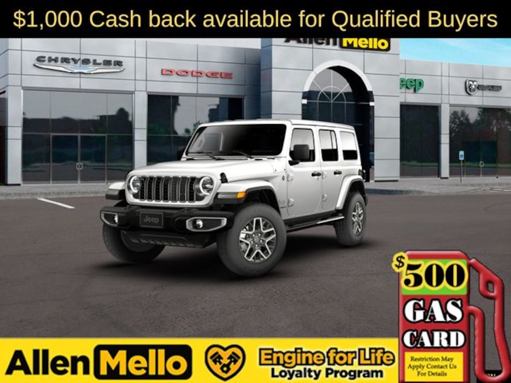 Allen Mello Chrysler Jeep Dodge Ram is proud to present you with another True Market Priced Vehicle. This 2026 Jeep Wrangler Sahara is loaded with the following Factory Options: Quick Order Package 24G, Sahara Popular Equipment Group (12.3" Touchscreen Display, 4G LTE Wi-Fi Hot Spot, Alpine Premium Audio System, Apple CarPlay, Auto High Beam Headlamp Control, Auto-Dimming Rear-View Mirror, Blind Spot & Cross Path Detection, Connected Travel & Traffic Services, Connectivity - US/Canada, For More Info, Call 800-643-2112, Google Android Auto, GPS Navigation, Hard Seat Back, HD Radio, Integrated Center Stack Radio, Integrated Off-Road Camera, Integrated Voice Command w/Bluetooth, Leather Wrapped Park Brake Handle, Leather Wrapped Shift Knob, McKinley Trimmed Seats, ParkSense Rear Park Assist System, Power 4-Way Driver Lumbar Adjust, Power 4-Way Passenger Lumbar Adjust, Power Adjust 8-Way Driver Seat, Power Adjust 8-Way Front Passenger Seat, Radio: Uconnect 5 Nav w/12.3" Display, Side Steps, SiriusXM Radio Service, SiriusXM w/360L, and Universal Garage Door Opener), 3.45 Overall Top Gear Ratio, 4-Wheel Disc Brakes, 8 Speakers, ABS brakes, Air Conditioning, Alloy wheels, AM/FM radio: SiriusXM with 360L, Apple CarPlay/Android Auto, Automatic temperature control, Aux Battery, Body Color 3-Piece Hard Top, Brake assist, Cloth Low-Back Bucket Seats, Compass, Delay-off headlights, Driver door bin, Driver vanity mirror, Dual front impact airbags, Dual front side impact airbags, Electronic Stability Control, Emergency communication system: Jeep Connect, Freedom Panel Storage Bag, Front anti-roll bar, Front Bucket Seats, Front Center Armrest w/Storage, Front dual zone A/C, Front fog lights, Front License Plate Bracket, Front reading lights, Fully automatic headlights, Heated door mirrors, Heated front seats, Heated steering wheel, Heavy Duty Suspension w/Gas Shocks, Illuminated entry, Integrated roll-over protection, Jeep Trail Rated Kit, Low tire pressure warning, MOPAR All-Weather Floor Mats, MyFlexCare Service Plan, No Soft Top, Non-Lock Fuel Cap w/o Discriminator, Occupant sensing airbag, Outside temperature display, Overhead airbag, Panic alarm, ParkView Rear Back-Up Camera, Passenger door bin, Passenger vanity mirror, Power door mirrors, Power steering, Power windows, Radio data system, Radio: Uconnect 5 w/12.3" Display, Rear anti-roll bar, Rear reading lights, Rear Window Defroster, Rear Window Wiper/Washer, Remote keyless entry, Security system, Speed control, Split folding rear seat, Steering wheel mounted audio controls, Stop-Start Dual Battery System, Tachometer, Telescoping steering wheel, Tilt steering wheel, Traction control, Trip computer, Variably intermittent wipers, Voltmeter, and Wheels: 18" x 7.5" Machine/Painted Gray!!