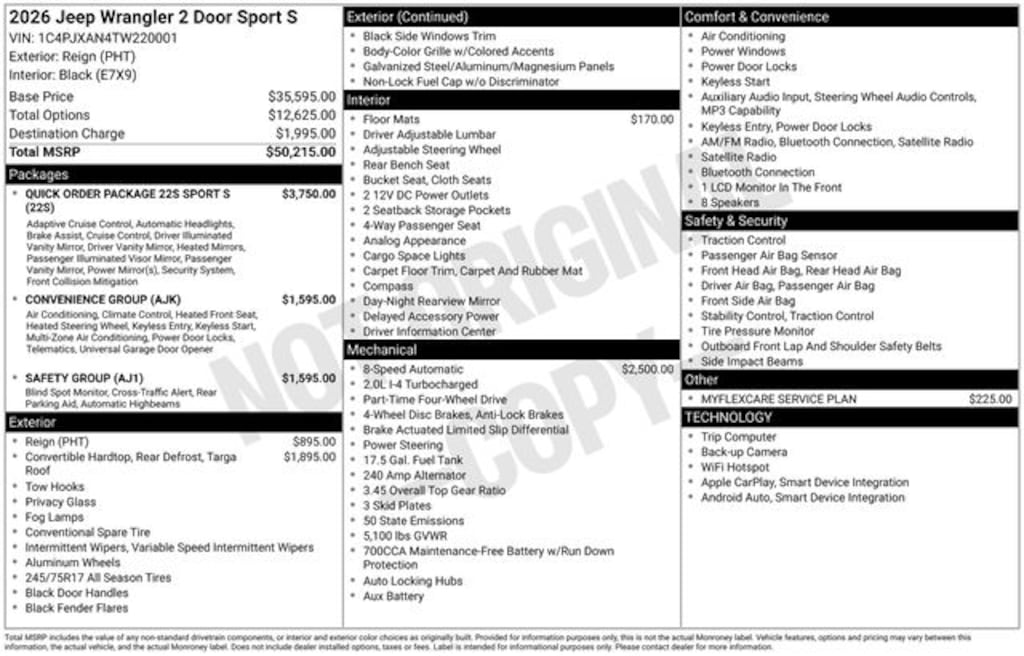 Allen Mello Chrysler Jeep Dodge Ram is proud to present you with another True Market Priced Vehicle. This 2026 Jeep Wrangler Sport S is loaded with the following Factory Options: Convenience Group (2-Door Passive Entry, Front Door Locks, Air Conditioning with Auto Temp Control, Air Filtering, Cluster 7.0" TFT Color Display, Emergency/Assistance Call, Heated Front Seats, Heated Steering Wheel, and Universal Garage Door Opener), Quick Order Package 22S Sport S (Advanced Brake Assist, Automatic Headlamps, Corning Gorilla Glass, Deep Tint Sunscreen Windows, Enhanced Adaptive Cruise Control, Full Speed Forward Collision Warning Plus, Power Heated Mirrors, Premium Wrapped Steering Wheel, Security Alarm, Sun Visors with Illuminated Vanity Mirrors, and Wheels: 17" x 7.5" Gray), Safety Group (Auto High Beam Headlamp Control, Blind Spot and Cross Path Detection, Injection Molded Black Rear Bumper, LED Taillamps, and ParkSense Rear Park Assist System), 12.3" Touchscreen Display, 3.45 Overall Top Gear Ratio, 4-Wheel Disc Brakes, 4G LTE Wi-Fi Hot Spot, 8 Speakers, ABS brakes, Air Conditioning, AM/FM radio: SiriusXM with 360L, Apple CarPlay, Apple CarPlay/Android Auto, Aux Battery, Black 3-Piece Hard Top, Brake assist, Cloth Low-Back Bucket Seats, Compass, Connectivity - US/Canada, Delay-off headlights, Driver door bin, Driver vanity mirror, Dual front impact airbags, Dual front side impact airbags, Electronic Stability Control, For More Info, Call 800-643-2112, Freedom Panel Storage Bag, Front anti-roll bar, Front Bucket Seats, Front Center Armrest w/Storage, Front fog lights, Front reading lights, Google Android Auto, Illuminated entry, Integrated Center Stack Radio, Integrated roll-over protection, Low tire pressure warning, MOPAR All-Weather Floor Mats, Myflexcare Service Plan, Non-Lock Fuel Cap Without Discriminator, Normal Duty Suspension, Occupant sensing airbag, Outside temperature display, Overhead airbag, Panic alarm, ParkView Rear Back-Up Camera, Passenger door bin, Passenger vanity mirror, Power steering, Power windows, Radio data system, Radio: Uconnect 5 with 12.3" Display, Rear anti-roll bar, Rear reading lights, Rear Window Defroster, Rear Window Wiper/Washer, Remote keyless entry, SiriusXM Radio Service, SiriusXM with 360L, Speed control, Steering wheel mounted audio controls, Stop-Start Dual Battery System, Tachometer, Telescoping steering wheel, Tilt steering wheel, Traction control, Trip computer, Variably intermittent wipers, and Wheels: 17" x 7.5" Black Steel Styled!!