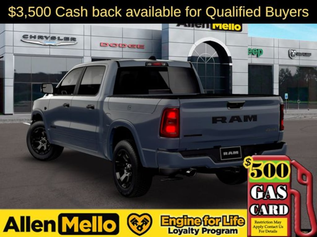 Allen Mello Chrysler Jeep Dodge Ram is proud to present you with another True Market Priced Vehicle. This 2026 Ram 1500 Big Horn/Lone Star is loaded with the following Factory Options: Bed Utility Group (Exterior 115V AC Outlet, MOPAR 4 Adjustable Cargo Tie-Down Hooks, MOPAR Spray in Bedliner, and Pick-Up Box Lighting), Big Horn Level 2 Equipment Group (115V Auxiliary Power Outlet, 115V Auxiliary Rear Power Outlet, 12" Touchscreen Display, 2nd Row in Floor Storage Bins, 3 Rear Seat Head Restraints, 4 Way Front Headrests, 400W Inverter, 4G LTE Wi-Fi Hot Spot, 9 Amplified Speakers with Subwoofer, Air Conditioning ATC with Dual Zone Control, Apple CarPlay, Auto Power-Folding Mirrors, Auto-Dimming Exterior Driver Mirror, Auto-Dimming Rear-View Mirror, Black Exterior Mirrors, Black Premium Power Mirrors, Body Color Fender Flares, Bucket Seats, Center Console Parts Module, Cluster 7.0" TFT Color Display, Configurable Drive Mode, Connected Travel and Traffic Services, Connectivity - US/Canada, Convex Wide-Angle Exterior Mirror Insert, Deluxe Cloth Bucket Seats, Disassociated Touchscreen Display, Exterior Mirrors Courtesy Lamps, Exterior Mirrors with Heating Element, Exterior Mirrors with Supplemental Signals, Front Seat Back Map Pockets, Full Length Floor Console, Global Telematics Box Module, Glove Box Lamp, Google Android Auto, GPS Antenna Input, GPS Navigation, HD Radio, Heated Front Seats, Heated Steering Wheel, Integrated Center Stack Radio, Integrated Voice Command with Bluetooth, Leather Wrapped Steering Wheel, LED Dome Lamp with on/Off Switch, LED Footwell Lighting, Manual Adjust 4-Way Front Passenger Seat, Media Hub with 2 Charge Only USBs, Overhead LED Lamps, Power 2-Way Driver Lumbar Adjust, Power Adjust 8-Way Driver Seat, Power Adjustable Pedals, Premium Overhead Console, Radio: Uconnect 5 Navigation with 12.0" Display, Rear 60/40 Folding Seat, Rear Center Armrest, Rear Power Sliding Window, Rear Window Defroster, Remote Tailgate Release, Security Alarm, SiriusXM Radio Service, SiriusXM with 360L, Steering Wheel Mounted Audio Controls, Sun Visors with Illuminated Vanity Mirrors, Universal Garage Door Opener, and USB Host Flip), Night Edition (Accent Color Door Handles, Accent Color Premium Power Mirrors, Accent Color Tailgate Handle, Anti-Spin Differential Rear Axle, Black Exterior Truck Badging, Black Headlamp Bezels, Black Interior Accents, Black Painted Exterior Mirrors Caps, Black Tail Lamp Bezels, Body Color Front Bumper, Body Color Rear Bumper with Step Pads, Dual Exhaust with Black Tips, Grille Black Surround Black Mesh, RAM Grille Badge - Black, and Wheels: 20" x 9.0" Aluminum Painted Clad), Quick Order Package 27Z Big Horn, 4-Wheel Disc Brakes, 48V Belt Starter Generator, 6 Speakers, ABS brakes, Air Conditioning, Alloy wheels, AM/FM radio, Apple CarPlay/Android Auto, Auto High-beam Headlights, Brake assist, Bumpers: chrome, Cloth Bucket Seats, Cluster 12" TFT Color Displ Discount includes a $1,000 Hospital, Military, Firefighters, Police or School Employees must show proof of employment. Price does not include tax, title, license, and document fees. Not all customers qualify for all rebates. Contact us for more information. Price includes: $3500 - 2026 Na