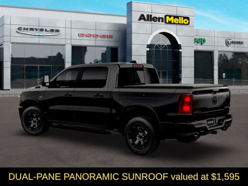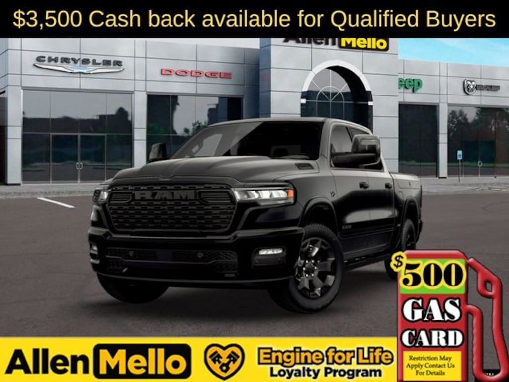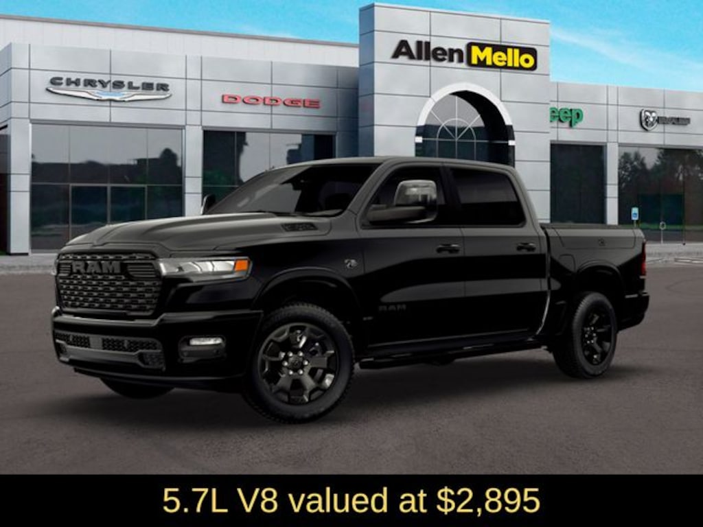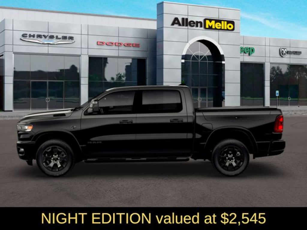 Allen Mello Chrysler Jeep Dodge Ram is proud to present you with another True Market Priced Vehicle. This 2026 Ram 1500 Big Horn/Lone Star is loaded with the following Factory Options: Big Horn Level 2 Equipment Group (115V Auxiliary Power Outlet, 115V Auxiliary Rear Power Outlet, 12" Touchscreen Display, 2nd Row in Floor Storage Bins, 3 Rear Seat Head Restraints, 4 Way Front Headrests, 400W Inverter, 4G LTE Wi-Fi Hot Spot, 9 Amplified Speakers with Subwoofer, Air Conditioning ATC with Dual Zone Control, Apple CarPlay, Auto Power-Folding Mirrors, Auto-Dimming Exterior Driver Mirror, Auto-Dimming Rear-View Mirror, Black Exterior Mirrors, Black Premium Power Mirrors, Body Color Fender Flares, Bucket Seats, Center Console Parts Module, Cluster 7.0" TFT Color Display, Configurable Drive Mode, Connected Travel and Traffic Services, Connectivity - US/Canada, Convex Wide-Angle Exterior Mirror Insert, Deluxe Cloth Bucket Seats, Disassociated Touchscreen Display, Exterior Mirrors Courtesy Lamps, Exterior Mirrors with Heating Element, Exterior Mirrors with Supplemental Signals, Front Seat Back Map Pockets, Full Length Floor Console, Global Telematics Box Module, Glove Box Lamp, Google Android Auto, GPS Antenna Input, GPS Navigation, HD Radio, Heated Front Seats, Heated Steering Wheel, Integrated Center Stack Radio, Integrated Voice Command with Bluetooth, Leather Wrapped Steering Wheel, LED Dome Lamp with on/Off Switch, LED Footwell Lighting, Manual Adjust 4-Way Front Passenger Seat, Media Hub with 2 Charge Only USBs, Overhead LED Lamps, Power 2-Way Driver Lumbar Adjust, Power Adjust 8-Way Driver Seat, Power Adjustable Pedals, Premium Overhead Console, Radio: Uconnect 5 Navigation with 12.0" Display, Rear 60/40 Folding Seat, Rear Center Armrest, Rear Power Sliding Window, Rear Window Defroster, Remote Tailgate Release, Security Alarm, SiriusXM Radio Service, SiriusXM with 360L, Steering Wheel Mounted Audio Controls, Sun Visors with Illuminated Vanity Mirrors, Universal Garage Door Opener, and USB Host Flip), Night Edition (Accent Color Door Handles, Accent Color Premium Power Mirrors, Accent Color Tailgate Handle, Anti-Spin Differential Rear Axle, Black Exterior Truck Badging, Black Headlamp Bezels, Black Interior Accents, Black Painted Exterior Mirrors Caps, Black Tail Lamp Bezels, Body Color Front Bumper, Body Color Rear Bumper with Step Pads, Dual Exhaust with Black Tips, Grille Black Surround Black Mesh, RAM Grille Badge - Black, and Wheels: 20" x 9.0" Aluminum Painted Clad), Quick Order Package 27Z Big Horn, Towing Technology Group (Trailer Hitch Line-Up Assist), Trailer Tow Group (Black Trailer Tow Power Mirrors, Manual Folding Exterior Mirrors, Manual Telescoping Mirrors, Mirror Clearance/Running Lights, Power-Adjustable Convex Aux Mirrors, Trailer Brake Control, Trailer Reverse Steering Control, Trailer Tire Pressure Monitoring System, and Trailer Tow Mirrors Discount includes a $1,000 Hospital, Military, Firefighters, Police or School Employees must show proof of employment. Price does not include tax, title, license, and document fees. Not all customers qualify for all rebates. Contact us for more information. Price includes: $3500 - 2