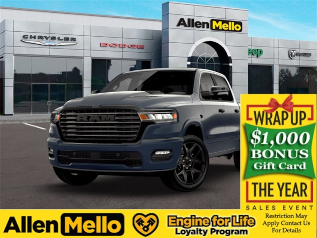 Allen Mello Chrysler Jeep Dodge Ram is proud to present you with another True Market Priced Vehicle. This 2026 Ram 1500 Laramie is loaded with the following Factory Options: Bed Utility Group (Exterior 115V AC Outlet, MOPAR 4 Adjustable Cargo Tie-Down Hooks, and MOPAR Spray in Bedliner), Laramie Level 2 Equipment Group (14.4" Touchscreen Display, 4G LTE Wi-Fi Hot Spot, Cluster 12" TFT Color Display, Connected Travel and Traffic Services, Connectivity - US/Canada, Front Passenger Interactive Display, GPS Navigation, Harman/Kardon 19 Speaker Premium Sound, Integrated Center Stack Radio, Integrated Voice Command with Bluetooth, Power Tailgate, Radio: Uconnect 5 Nav with 14.4" Display, Rain Sensitive Windshield Wipers, SiriusXM Radio Service, SiriusXM with 360L, and USB Host Flip), Night Edition (Accent Color Door Handles, Accent Color Premium Power Mirrors, Accent Color Tailgate Handle, Anti-Spin Differential Rear Axle, Auto Power-Folding Mirrors, Auto-Dimming Exterior Driver Mirror, Black Exterior Truck Badging, Black Headlamp Bezels, Black Interior Accents, Black Painted Exterior Mirrors Caps, Black Tail Lamp Bezels, Body Color Front Bumper, Body Color Rear Bumper with Step Pads, Convex Wide-Angle Exterior Mirror Insert, Dual Exhaust with Black Tips, Exterior Mirrors Approach Lamps, Exterior Mirrors Courtesy Lamps, Exterior Mirrors with Heating Element, Exterior Mirrors with Memory, Exterior Mirrors with Supplemental Signals, Grille Surround 3 Black Texture 2 Black, Pirelli Brand Tires, Proximity Approach/Departure Lamps, RAM Grille Badge - Black, Sport Performance Hood, and Wheels: 22" x 9" Forged Aluminum), Quick Order Package 27H Laramie, 10 Speakers, 4-Wheel Disc Brakes, ABS brakes, Active Noise Control System, Air Conditioning, Alloy wheels, AM/FM radio: SiriusXM with 360L, Apple CarPlay/Android Auto, Audio memory, Auto High-beam Headlights, Auto-dimming door mirrors, Auto-dimming Rear-View mirror, Automatic temperature control, Brake assist, Bumpers: chrome, Chrome Exterior Mirrors, Compass, Delay-off headlights, Dome Dual LED Reading Lamp, Driver door bin, Driver vanity mirror, Dual front impact airbags, Dual front side impact airbags, Dual-Pane Panoramic Sunroof, Electronic Stability Control, Front anti-roll bar, Front Bucket Seats, Front Center Armrest w/Storage, Front dual zone A/C, Front fog lights, Front License Plate Bracket, Front reading lights, Front wheel independent suspension, Fully automatic headlights, Garage door transmitter, Heated door mirrors, Heated front seats, Heated rear seats, Heated steering wheel, Illuminated entry, Leather steering wheel, Leather Trimmed Bucket Seats, LED Dome/Reading Lamp, Low tire pressure warning, Manufacturer's Statement of Origin, Memory seat, MOPAR Front and Rear Rubber Floor Mats, MyFlexCare Service Plan, Navigation System, Occupant sensing airbag, Off-Road Information Pages, Outside tempera Discount includes a $1,000 Hospital, Military, Firefighters, Police or School Employees must show proof of employment. Price does not include tax, title, license, and document fees. Not all customers qualify for all rebates. Contact us for more information. Price includes: $3500 - 2026 Natio