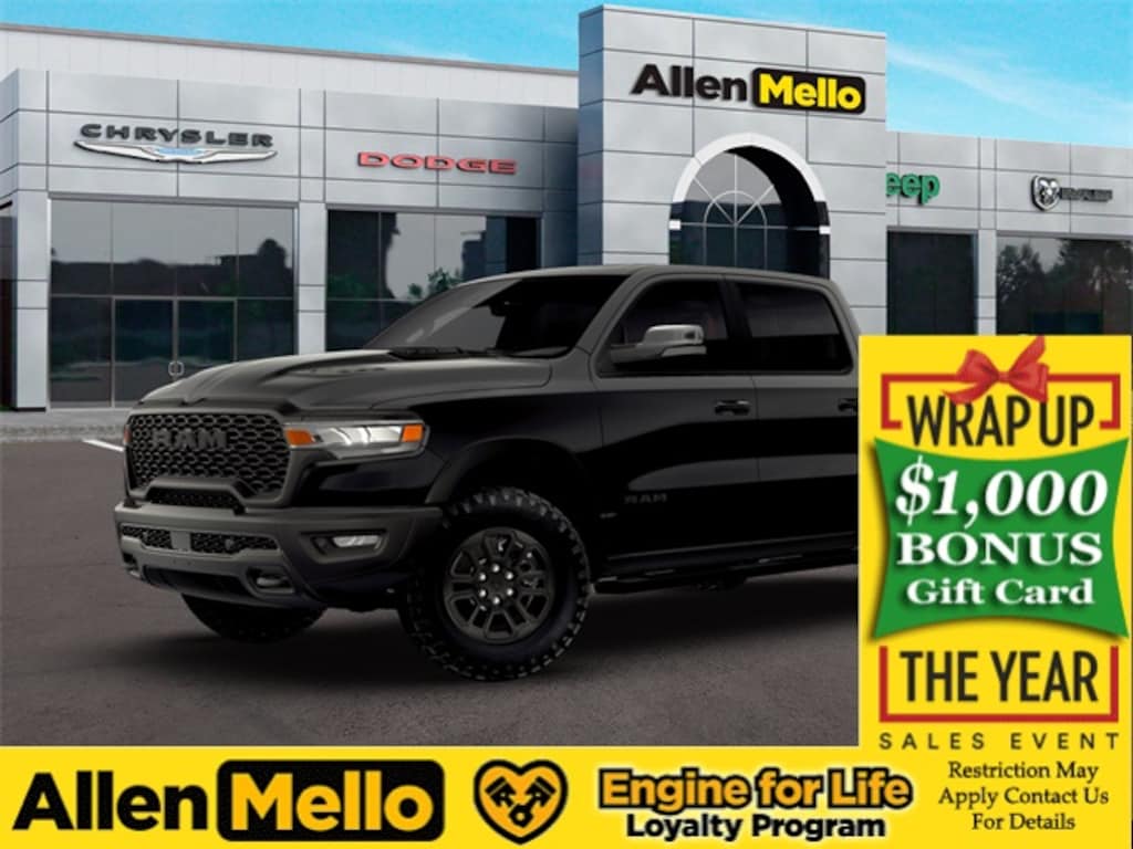 Allen Mello Chrysler Jeep Dodge Ram is proud to present you with another True Market Priced Vehicle. This 2026 Ram 1500 Rebel is loaded with the following Factory Options: Bed Utility Group (Exterior 115V AC Outlet, MOPAR 4 Adjustable Cargo Tie-Down Hooks, and MOPAR Spray in Bedliner), Quick Order Package 21W Rebel, Rebel Level 2 Equipment Group (115V Auxiliary Rear Power Outlet, 14.4" Touchscreen Display, 2-Door Passive Entry, Front Door Locks, 4G LTE Wi-Fi Hot Spot, Accent Color Door Handles, Accent Color Premium Power Mirrors, Accent Color Tailgate Handle, Apple CarPlay, Auto Power-Folding Mirrors, Auto-Dimming Exterior Driver Mirror, Black Painted Exterior Mirrors Caps, Connected Travel and Traffic Services, Connectivity - US/Canada, Convex Wide-Angle Exterior Mirror Insert, Disassociated Touchscreen Display, Driver Seat Memory, Dual Wireless Charging Pad, Exterior Mirrors Approach Lamps, Exterior Mirrors Courtesy Lamps, Exterior Mirrors with Heating Element, Exterior Mirrors with Memory, Exterior Mirrors with Supplemental Signals, Front Passenger Interactive Display, Global Telematics Box Module, Google Android Auto, GPS Antenna Input, GPS Navigation, Harman/Kardon 19 Speaker Premium Sound, HD Radio, Heated Second Row Seats, Integrated Center Stack Radio, Integrated Voice Command with Bluetooth, Media Hub with 2 Charge Only USBs, Off-Road Information Pages, Power 2-Way Passenger Lumbar Adjust, Power Adjust 8-Way Front Passenger Seat, Power Adjustable Pedals with Memory, Power Tailgate, Proximity Approach/Departure Lamps, Radio: Uconnect 5 Nav with 14.4" Display, Radio/Driver Seat/Mirrors/Pedals Memory, Rain Sensitive Windshield Wipers, Rear Window Defroster, Security Alarm, SiriusXM Radio Service, SiriusXM with 360L, Smartphone as a Key Capable, and USB Host Flip), 10 Speakers, 3.92 Rear Axle Ratio, 4 Way Front Headrests, 4-Wheel Disc Brakes, ABS brakes, Active Noise Control System, Air Conditioning, Alloy wheels, AM/FM radio: SiriusXM with 360L, Apple CarPlay/Android Auto, Auto High-beam Headlights, Auto-dimming Rear-View mirror, Automatic temperature control, Black Exterior Mirrors, Brake assist, Bucket Seats, Cloth/Vinyl Bucket Seats, Compass, Delay-off headlights, Dome Dual LED Reading Lamp, Driver door bin, Driver vanity mirror, Dual front impact airbags, Dual front side impact airbags, Dual-Pane Panoramic Sunroof, Electronic Stability Control, Front anti-roll bar, Front Bucket Seats, Front Center Armrest w/Storage, Front dual zone A/C, Front fog lights, Front License Plate Bracket, Front reading lights, Front Seat Back Map Pockets, Front wheel independent suspension, Full Length Upgraded Floor Console, Fully automatic headlights, Garage door transmitter, Heated door mirrors, Heated Front Seats, Heated front seats, Heated Steering Wheel, Heated steering wheel, Illuminated entry, Leather steering wheel, Low tire pressure warning, Manual Folding Exterior Mirrors, M Discount includes a $1,000 Hospital, Military, Firefighters, Police or School Employees must show proof of employment. Price does not include tax, title, license, and document fees. Not all customers qualify for all rebates. Contact us for more information. Price includes: $3500 - 2026 Natio
