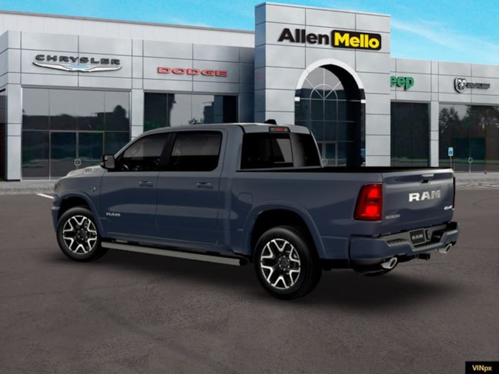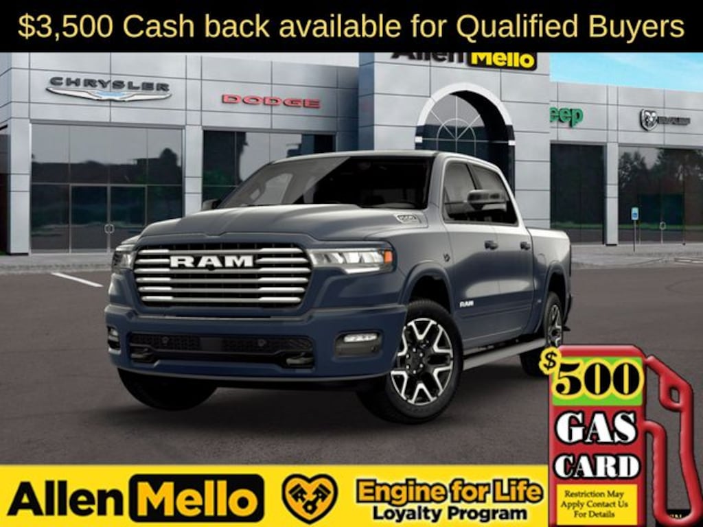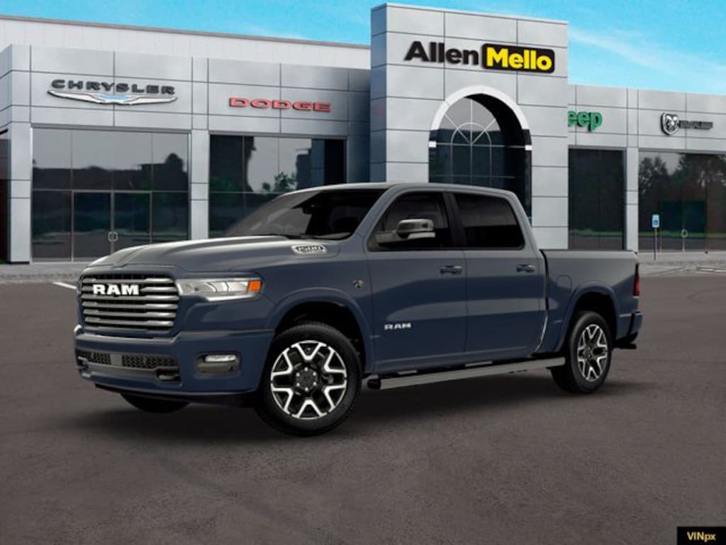 Allen Mello Chrysler Jeep Dodge Ram is proud to present you with another True Market Priced Vehicle. This 2026 Ram 1500 Laramie is loaded with the following Factory Options: Bed Utility Group (Exterior 115V AC Outlet, MOPAR 4 Adjustable Cargo Tie-Down Hooks, and MOPAR Spray in Bedliner), Laramie Level 2 Equipment Group (14.4" Touchscreen Display, 4G LTE Wi-Fi Hot Spot, Cluster 12" TFT Color Display, Connected Travel and Traffic Services, Connectivity - US/Canada, Front Passenger Interactive Display, GPS Navigation, Harman/Kardon 19 Speaker Premium Sound, Integrated Center Stack Radio, Integrated Voice Command with Bluetooth, Power Tailgate, Radio: Uconnect 5 Nav with 14.4" Display, Rain Sensitive Windshield Wipers, SiriusXM Radio Service, SiriusXM with 360L, and USB Host Flip), Laramie Preferred Package (Accent Color Premium Power Mirrors, Auto Power-Folding Mirrors, Auto-Dimming Exterior Driver Mirror, Black Painted Exterior Mirrors Caps, Body Color Front Bumper, Body Color Rear Bumper with Step Pads, Convex Wide-Angle Exterior Mirror Insert, Dome Dual LED Reading Lamp, Dual-Pane Panoramic Sunroof, Exterior Mirrors Courtesy Lamps, Exterior Mirrors with Heating Element, Exterior Mirrors with Memory, Exterior Mirrors with Supplemental Signals, Grille Surround 3 Body Color Tex 4 Chrome, LED Dome/Reading Lamp, Power Deployable Running Boards, RAM Grille Badge - Chrome, Tow Hooks, and Trailer Brake Control), Quick Order Package 27H Laramie, 10 Speakers, 4-Wheel Disc Brakes, ABS brakes, Active Noise Control System, Adjustable pedals, Air Conditioning, Alloy wheels, AM/FM radio: SiriusXM with 360L, Anti-Spin Differential Rear Axle, Apple CarPlay/Android Auto, Audio memory, Auto High-beam Headlights, Auto-dimming door mirrors, Auto-dimming Rear-View mirror, Automatic temperature control, Brake assist, Bumpers: chrome, Chrome Exterior Mirrors, Compass, Delay-off headlights, Driver door bin, Driver vanity mirror, Dual front impact airbags, Dual front side impact airbags, Electronic Stability Control, Front anti-roll bar, Front Bucket Seats, Front Center Armrest w/Storage, Front dual zone A/C, Front fog lights, Front License Plate Bracket, Front reading lights, Front wheel independent suspension, Fully automatic headlights, Garage door transmitter, Heated door mirrors, Heated front seats, Heated rear seats, Heated steering wheel, Illuminated entry, Leather steering wheel, Leather Trimmed Bucket Seats, Low tire pressure warning, Manufacturer's Statement of Origin, Memory seat, MOPAR Front and Rear Rubber Floor Mats, MyFlexCare Service Plan, Navigation System, Occupant sensing airbag, Off-Road Information Pages, Outside temperature display, Overhead airbag, Overhead console, Panic alarm, ParkView Rear Back-Up Camera, Passenger door bin, Passenger vanity mirror, Pedal memory, Power door mirrors, Power driver seat, Power passenger seat, Power steering, Power windows, Radio data system, Radio: Uconnect 5 Navig Discount includes a $1,000 Hospital, Military, Firefighters, Police or School Employees must show proof of employment. Price does not include tax, title, license, and document fees. Not all customers qualify for all rebates. Contact us for more information. Price includes: $3500 - 2026 Na