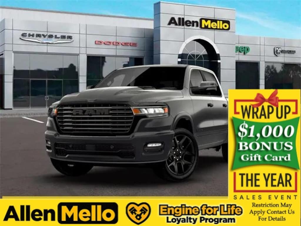 Allen Mello Chrysler Jeep Dodge Ram is proud to present you with another True Market Priced Vehicle. This 2026 Ram 1500 Laramie is loaded with the following Factory Options: Bed Utility Group (Exterior 115V AC Outlet, MOPAR 4 Adjustable Cargo Tie-Down Hooks, and MOPAR Spray in Bedliner), Laramie Level 2 Equipment Group (14.4" Touchscreen Display, 4G LTE Wi-Fi Hot Spot, Cluster 12" TFT Color Display, Connected Travel and Traffic Services, Connectivity - US/Canada, Front Passenger Interactive Display, GPS Navigation, Harman/Kardon 19 Speaker Premium Sound, Integrated Center Stack Radio, Integrated Voice Command with Bluetooth, Power Tailgate, Radio: Uconnect 5 Nav with 14.4" Display, Rain Sensitive Windshield Wipers, SiriusXM Radio Service, SiriusXM with 360L, and USB Host Flip), Night Edition (Accent Color Door Handles, Accent Color Premium Power Mirrors, Accent Color Tailgate Handle, Anti-Spin Differential Rear Axle, Auto Power-Folding Mirrors, Auto-Dimming Exterior Driver Mirror, Black Exterior Truck Badging, Black Headlamp Bezels, Black Interior Accents, Black Painted Exterior Mirrors Caps, Black Tail Lamp Bezels, Body Color Front Bumper, Body Color Rear Bumper with Step Pads, Convex Wide-Angle Exterior Mirror Insert, Dual Exhaust with Black Tips, Exterior Mirrors Approach Lamps, Exterior Mirrors Courtesy Lamps, Exterior Mirrors with Heating Element, Exterior Mirrors with Memory, Exterior Mirrors with Supplemental Signals, Grille Surround 3 Black Texture 2 Black, Pirelli Brand Tires, Proximity Approach/Departure Lamps, RAM Grille Badge - Black, Sport Performance Hood, and Wheels: 22" x 9" Forged Aluminum), Quick Order Package 21H Laramie, 10 Speakers, 4-Wheel Disc Brakes, ABS brakes, Active Noise Control System, Air Conditioning, Alloy wheels, AM/FM radio: SiriusXM with 360L, Apple CarPlay/Android Auto, Audio memory, Auto High-beam Headlights, Auto-dimming door mirrors, Auto-dimming Rear-View mirror, Automatic temperature control, Brake assist, Bumpers: chrome, Chrome Exterior Mirrors, Compass, Delay-off headlights, Dome Dual LED Reading Lamp, Driver door bin, Driver vanity mirror, Dual front impact airbags, Dual front side impact airbags, Dual-Pane Panoramic Sunroof, Electronic Stability Control, Front anti-roll bar, Front Bucket Seats, Front Center Armrest w/Storage, Front dual zone A/C, Front fog lights, Front License Plate Bracket, Front reading lights, Front wheel independent suspension, Fully automatic headlights, Garage door transmitter, Heated door mirrors, Heated front seats, Heated rear seats, Heated steering wheel, Illuminated entry, Leather steering wheel, Leather Trimmed Bucket Seats, LED Dome/Reading Lamp, Low tire pressure warning, Manufacturer's Statement of Origin, Memory seat, MOPAR Front and Rear Rubber Floor Mats, MyFlexCare Service Plan, Navigation System, Occupant sensing airbag, Off-Road Information Pages, Outside temperature display, Overhead Discount includes a $1,000 Hospital, Military, Firefighters, Police or School Employees must show proof of employment. Price does not include tax, title, license, and document fees. Not all customers qualify for all rebates. Contact us for more information. Price includes: $3500 - 2026 Natio