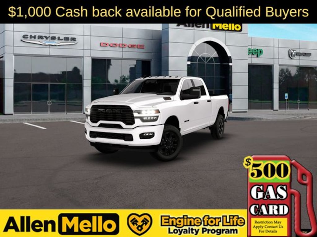 Allen Mello Chrysler Jeep Dodge Ram is proud to present you with another True Market Priced Vehicle. This 2026 Ram 2500 Big Horn is loaded with the following Factory Options: Big Horn Level 1 Plus Equipment Group (12" Touchscreen Display, 2 Way Rear Headrest Seat, 2nd Row in Floor Storage Bins, 4 Way Front Headrests, 40/20/40 Split Bench Seat, 4G LTE Wi-Fi Hot Spot, 9 Alpine Speakers with Subwoofer, Air Conditioning ATC with Dual Zone Control, Alexa Built-in, Anti-Spin Differential Rear Axle, Apple CarPlay, Auto Power-Folding Mirrors, Auto-Dimming Rear-View Mirror, Black Exterior Mirrors, Connected Travel and Traffic Services, Connectivity - US/Canada, Disassociated Touchscreen Display, Dual Glove Boxes, Emergency Vehicle Alert System (EVAS), Exterior Mirrors Courtesy Lamps, Exterior Mirrors with Heating Element, Exterior Mirrors with Supplemental Signals, Foam Bottle Insert (door Trim Panel), Folding Flat Load Floor Storage, Footwell Courtesy Lamp, For Details, Visit DriveUconnect.com, For More Info, Call 800-643-2112, Forward and Reverse Utility Lights, Front Armrest with Cupholders, Front Center Seat Cushion Storage, Front Seat Back Map Pockets, Global Telematics Box Module, Glove Box Lamp, Google Android Auto, GPS Antenna Input, GPS Navigation, HD Radio, Integrated Voice Command with Bluetooth, LED Bed Lighting, Locking Lower Glove Box, Luxury Steering Wheel, Manual Adjust 4-Way Front Passenger Seat, Mirror Running Lights, MOPAR Deployable Bed Step, MOPAR Spray in Bedliner, Off-Road Info Pages, Power 2-Way Driver Lumbar Adjust, Power Adjust 8-Way Driver Seat, Power Adjust Mirrors, Power Heated Folding Telescopic Mirrors, Power Telescoping Mirrors, Power-Adjustable Convex Aux Mirrors, Premium Cloth 40/20/40 Bench Seat, Radio: Uconnect 5 Navigation with 12.0" Display, Rear 60/40 Folding Seat, Rear Dome with on/Off Switch Lamp, Remote Start System, Remote USB Port - Charge Only, Selectable Tire Fill Alert, SiriusXM Radio Service, SiriusXM with 360L, Steering Wheel Mounted Audio Controls, Storage Tray, and Trailer Tow Pages), Heated Seats and Wheel Group (Heated Front Seats and Heated Steering Wheel), Night Edition (Black Exterior Truck Badging, Black Interior Accents, Black Wheel Center Hub, Body Color Grille-Surround, Gloss Black Nostrils/Mic Black Grille, Painted Front Bumper, Painted Rear Bumper, and Wheels: 20" x 8.0" Black Painted Aluminum), Quick Order Package 2UZ Big Horn, 4-Wheel Disc Brakes, 6 Speakers, ABS brakes, Air Conditioning, Alloy wheels, AM/FM radio: SiriusXM, Apple CarPlay/Android Auto, Brake assist, Bumpers: chrome, Center Hub, Clearance Lamps, Cloth 40/20/40 Bench Seat, Compass, Dash Pass Thru Wire Circuits, Delay-off headlights, Driver door bin, Dual Alternators Rated At 400 Amps, Dual front impact airbags, Dual front side impact airbags, Electronic Stability Control, Front anti-roll bar, Front Center Armrest w/Storage, Front fog lights, Front License Plate Bracket, Front reading lights, Fully automatic headligh Discount includes a $1,000 Hospital, Military, Firefighters, Police or School Employees must show proof of employment. Price does not include tax, title, license, and document fees. Not all customers qualify for all rebates. Contact us for more information. Price includes: $1000 -