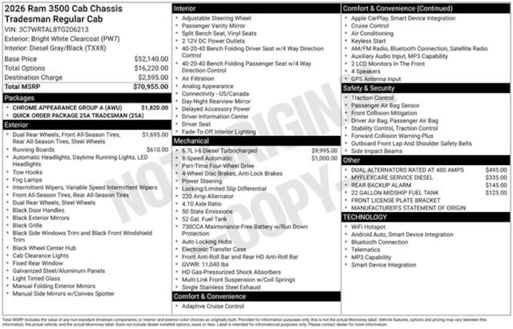 Allen Mello Chrysler Jeep Dodge Ram is proud to present you with another True Market Priced Vehicle. This 2026 Ram 3500 Tradesman is loaded with the following Factory Options: Chrome Appearance Group A (Bright Front Bumper, Bright Wheel Skins, Center Hub, Chrome Grille Surround, and Matte Black Mesh Grille with Chrome), Quick Order Package 25A Tradesman, 11.50" Dual Wheels Rear Axle, 22 Gallon Midship Fuel Tank, 4 Speakers, 4-Wheel Disc Brakes, 40/20/40 Split Bench Seat, 4G LTE Wi-Fi Hot Spot, 6000# Front Axle with Hub Extension, ABS brakes, Air Conditioning, AM/FM radio: SiriusXM, Apple CarPlay, Apple CarPlay/Android Auto, Black Exterior Mirrors, Black Tubular Side Steps, Black Wheel Center Hub, Compass, Connectivity - US/Canada, Delay-off headlights, Driver door bin, Dual Alternators Rated At 480 Amps, Dual front impact airbags, Dual Rear Wheels, Electronic Stability Control, Emergency communication system: RAM Connect, For Details, Visit DriveUconnect.com, Front anti-roll bar, Front Armrest with Cupholders, Front Center Armrest w/Storage, Front fog lights, Front License Plate Bracket, Front reading lights, Fully automatic headlights, Global Telematics Box Module, Google Android Auto, GPS Antenna Input, HD Vinyl 40/20/40 Split Bench Seat, Integrated Voice Command with Bluetooth, Manual Adjust 4-Way Driver Seat, Manual Adjust 4-Way Front Passenger Seat, Manual Folding Exterior Mirrors, Manual Telescoping Mirrors, Manufacturer's Statement of Origin, MyFlexCare Service Diesel, Nexen Brand Tires, Occupant sensing airbag, Outside temperature display, Overhead console, Passenger door bin, Passenger vanity mirror, Power steering, Radio data system, Radio: Uconnect 5 with 8.4" Display, Rear anti-roll bar, Rear Backup Alarm, Remote USB Port - Charge Only, Speed control, Storage Tray, Tachometer, Temperature and Compass Gauge, Tilt steering wheel, Traction control, Variably intermittent wipers, Voltmeter, Wheels: 17" x 6.0" Steel Chrome Clad, Wheels: 18" x 8.0" Polished Aluminum, and Wheels: 18" x 8.0" Steel Painted!!