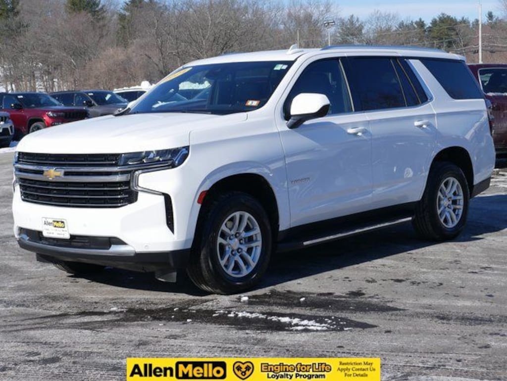 Allen Mello Chrysler Jeep Dodge Ram is proud to present you with another True Market Priced Pre-Owned Vehicle. This 2024 Chevrolet Tahoe LT is loaded with the following Factory Options: 4WD and Black Leather Preferred Equipment Group 1LT (1st & 2nd Row Color-Keyed Carpeted Floor Mats, Auto-Dimming Inside Rear-View Mirror, Bose 9-Speaker Stereo Audio System Feature, Bright Front & Rear Door Sill Plates, Color-Keyed Carpeting Floor Covering, Driver & Front Outboard Passenger Airbags, Enhanced Driver Information Center, Floor Console w/Storage Area, Hands-Free Rear Power Programmable Liftgate, LED Daytime Running Lamps, Memory Settings for Driver, Remote Start, SiriusXM w/360L, Universal Home Remote, Wireless Charging, and Wrapped Steering Wheel), 4WD, Black Leather, 10-Way Power Driver & Passenger Seat Adjusters, 3.23 Rear Axle Ratio, 3rd row seats: split-bench, 4-Wheel Disc Brakes, 9 Speakers, ABS brakes, Air Conditioning, Alloy wheels, AM/FM radio: SiriusXM with 360L, Apple CarPlay/Android Auto, Auto High-beam Headlights, Auto-dimming Rear-View mirror, Automatic temperature control, Brake assist, Bumpers: body-color, Compass, Delay-off headlights, Deleted 3 Years of OnStar Remote Access, Driver door bin, Driver vanity mirror, Dual front impact airbags, Dual front side impact airbags, Electronic Stability Control, Emergency communication system: OnStar and Chevrolet connected services capable, Four wheel independent suspension, Front anti-roll bar, Front Bucket Seats, Front Center Armrest, Front dual zone A/C, Front High-Back Reclining Bucket Seats, Front reading lights, Fully automatic headlights, Garage door transmitter, Heated door mirrors, Heated Driver & Front Passenger Seats, Heated front seats, Illuminated entry, Infotainment Display, Leather-Appointed Seat Trim, Low tire pressure warning, Memory seat, Navigation System, Occupant sensing airbag, Outside temperature display, Overhead airbag, Overhead console, Panic alarm, Passenger door bin, Passenger vanity mirror, Power door mirrors, Power driver seat, Power Liftgate, Power passenger seat, Power steering, Power windows, Premium audio system: Chevrolet Infotainment 3 Premium, Premium Smooth Ride Suspension, Radio: Chevrolet Infotainment 3 Premium System, Rain sensing wipers, Rear air conditioning, Rear anti-roll bar, Rear reading lights, Rear seat center armrest, Rear window defroster, Rear window wiper, Remote keyless entry, Roof rack: xxxxxx, Security system, Speed control, Speed-sensing steering, Split folding rear seat, Spoiler, Steering wheel mounted audio controls, Tachometer, Telescoping steering wheel, Tilt steering wheel, Traction control, Trip computer, Variably intermittent wipers, Voltmeter, and Wheels: 18" x 8.5" Bright Silver Painted Aluminum!!