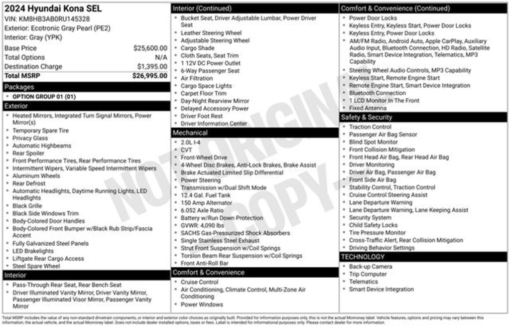 Allen Mello Chrysler Jeep Dodge Ram is proud to present you with another True Market Priced Pre-Owned Vehicle. This 2024 Hyundai Kona SEL is loaded with the following Factory Options: Option Group 01, 4-Wheel Disc Brakes, 6 Speakers, 6.052 Axle Ratio, ABS brakes, Air Conditioning, Alloy wheels, AM/FM radio: SiriusXM, Apple CarPlay & Android Auto, Auto High-beam Headlights, Automatic temperature control, Brake assist, Bumpers: body-color, Cloth Seat Trim, Delay-off headlights, Driver door bin, Driver vanity mirror, Dual front impact airbags, Dual front side impact airbags, Electronic Stability Control, Emergency communication system: Bluelink+, Exterior Parking Camera Rear, Front anti-roll bar, Front Bucket Seats, Front Center Armrest, Front dual zone A/C, Front reading lights, Front wheel independent suspension, Fully automatic headlights, Heated door mirrors, Illuminated entry, Leather Shift Knob, Leather steering wheel, Low tire pressure warning, Occupant sensing airbag, Outside temperature display, Overhead airbag, Panic alarm, Passenger door bin, Passenger vanity mirror, Power door mirrors, Power driver seat, Power steering, Power windows, Radio: AM/FM/HD Radio/SiriusXM Audio System, Rear seat center armrest, Rear window defroster, Rear window wiper, Remote keyless entry, Security system, Speed control, Speed-sensing steering, Split folding rear seat, Spoiler, Steering wheel mounted audio controls, Tachometer, Telescoping steering wheel, Tilt steering wheel, Traction control, Trip computer, Turn signal indicator mirrors, Variably intermittent wipers, and Wheels: 18" x 7.0J Glossy Black Alloy!!