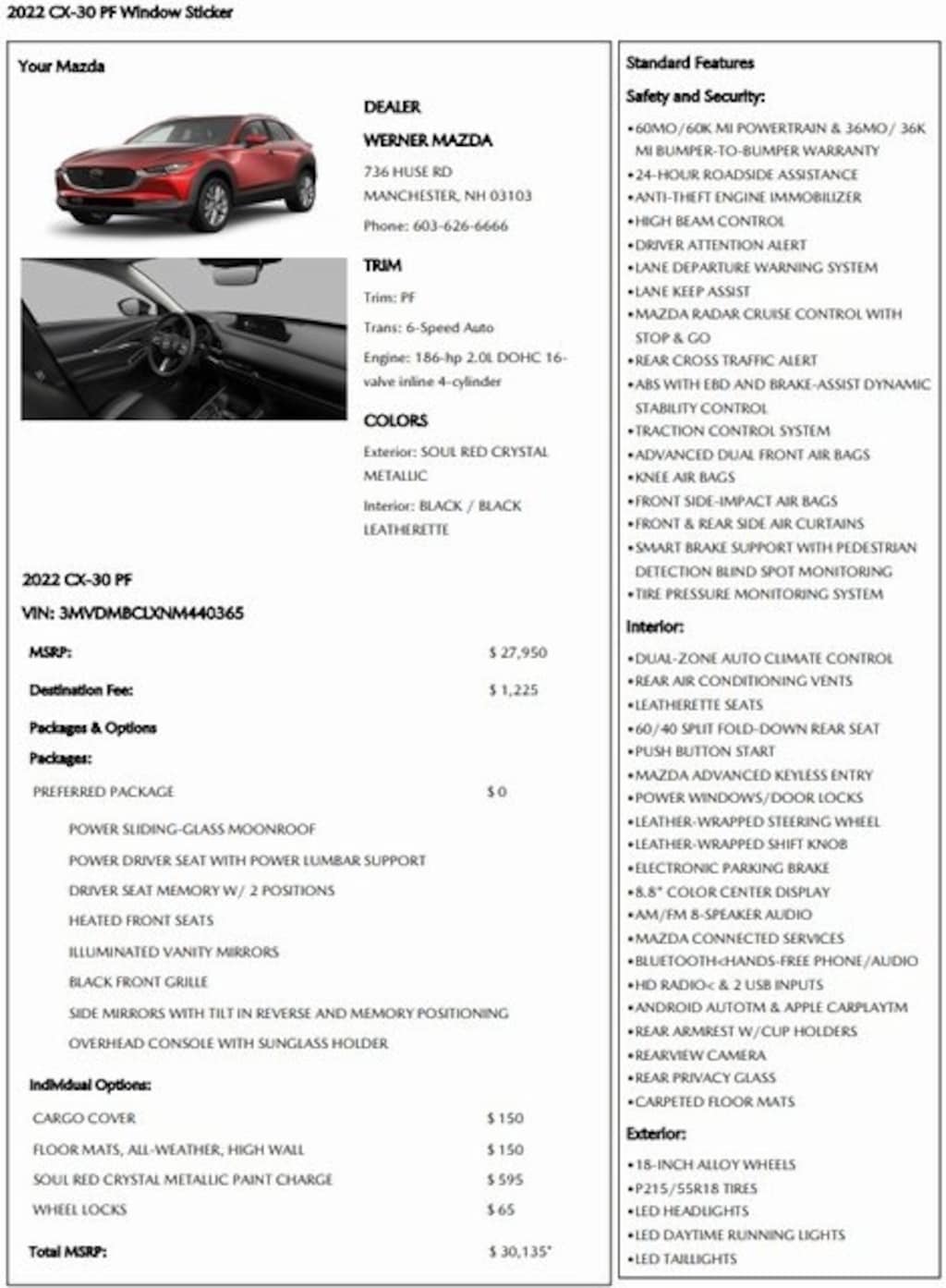 Allen Mello Chrysler Jeep Dodge Ram is proud to present you with another True Market Priced Pre-Owned Vehicle. This 2022 Mazda CX-30 2.5 S Preferred Package is loaded with the following Factory Options: 4-Wheel Disc Brakes, Air Conditioning, Automatic temperature control, Memory seat, Power moonroof, Rear window defroster, Speed-sensing steering, Steering wheel mounted audio controls, and Traction control 4-Wheel Disc Brakes, Air Conditioning, Automatic temperature control, Memory seat, Power moonroof, Rear window defroster, Speed-sensing steering, Steering wheel mounted audio controls, Traction control, 3.850 Axle Ratio, 8 Speakers, ABS brakes, Alloy wheels, AM/FM radio, AppLink/Apple CarPlay and Android Auto, Auto High-beam Headlights, Brake assist, Bumpers: body-color, Cargo Cover, Compass, Delay-off headlights, Driver door bin, Driver vanity mirror, Dual front impact airbags, Dual front side impact airbags, Electronic Stability Control, Emergency communication system: Mazda Connected Services (Automatic 911 Dialing), Exterior Parking Camera Rear, Front anti-roll bar, Front Bucket Seats, Front Center Armrest, Front dual zone A/C, Front reading lights, Front wheel independent suspension, Fully automatic headlights, Heated Front Bucket Seats, Heated front seats, High Wall All-Weather Floor Mats, Illuminated entry, Knee airbag, Leather Shift Knob, Leather steering wheel, Leatherette Seat Trim, Low tire pressure warning, MAZDA CONNECT Infotainment System, Occupant sensing airbag, Outside temperature display, Overhead airbag, Overhead console, Panic alarm, Passenger door bin, Passenger vanity mirror, Power door mirrors, Power driver seat, Power steering, Power windows, Radio data system, Radio: AM/FM/HD Audio System, Rain sensing wipers, Rear seat center armrest, Rear window wiper, Remote keyless entry, Roof rack: rails only, Soul Red Crystal Metallic Paint, Speed control, Split folding rear seat, Spoiler, Tachometer, Telescoping steering wheel, Tilt steering wheel, Trip computer, Turn signal indicator mirrors, Variably intermittent wipers, Wheel Locks, and Wheels: 18" x 7J Aluminum Alloy!!