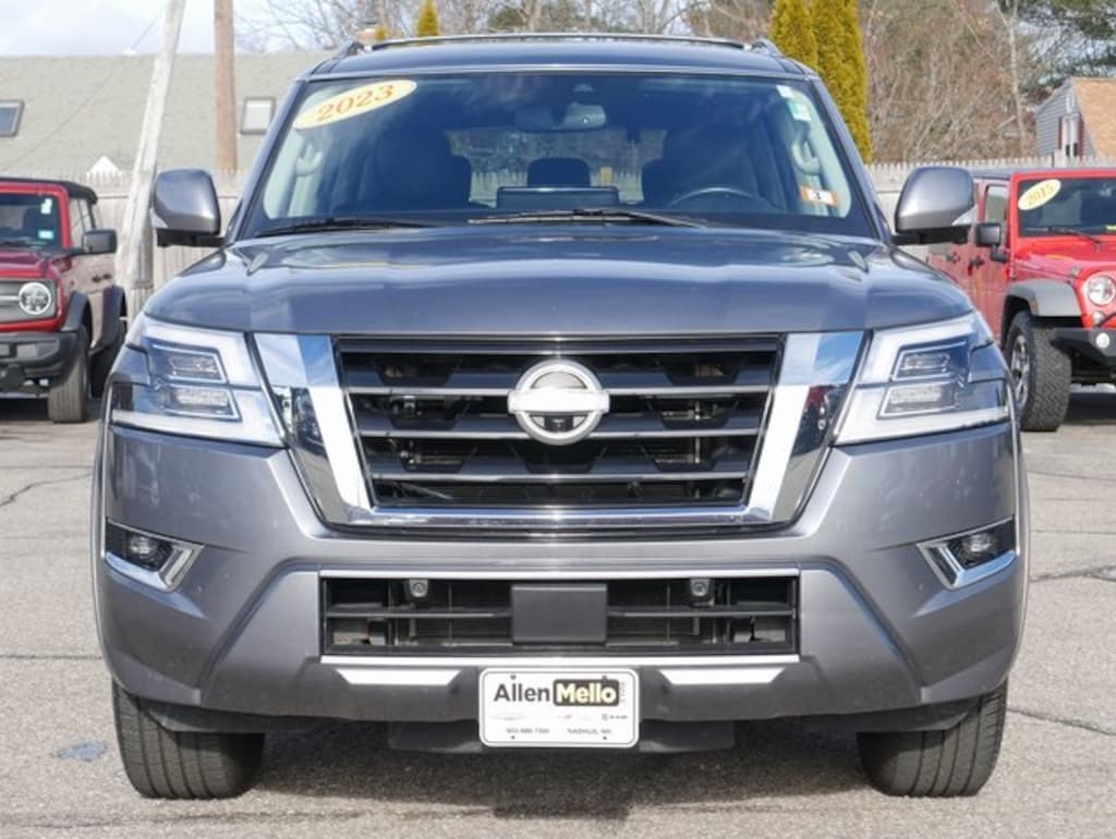 Allen Mello Chrysler Jeep Dodge Ram is proud to present you with another True Market Priced Pre-Owned Vehicle. This 2023 Nissan Armada SL is loaded with the following Factory Options: 4WD Cargo Package, 4WD, 13 Speakers, 2.94 Axle Ratio, 3rd Row Carpeted Floor Mats - Bench Seat, 3rd row seats: split-bench, 4-Wheel Disc Brakes, 6-Speaker Audio System, ABS brakes, Air Conditioning, Alloy wheels, AM/FM radio: SiriusXM, Anti-whiplash front head restraints, Auto High-beam Headlights, Auto tilt-away steering wheel, Auto-dimming door mirrors, Auto-dimming Rear-View mirror, Auto-leveling suspension, Automatic temperature control, Bose 13-Speaker Premium Audio System, Brake assist, Bumpers: body-color, Cross Bars, Delay-off headlights, Driver door bin, Driver vanity mirror, Dual front impact airbags, Dual front side impact airbags, Electronic Stability Control, Emergency communication system: NissanConnect Services, Exterior Parking Camera Rear, Four wheel independent suspension, Front anti-roll bar, Front Bucket Seats, Front Center Armrest, Front dual zone A/C, Front fog lights, Front reading lights, Fully automatic headlights, Garage door transmitter: HomeLink, Heated door mirrors, Heated Front Bucket Seats, Heated front seats, Heated steering wheel, Illuminated entry, Illuminated Kick Plates, Knee airbag, Leather Shift Knob, Leather-Appointed Seat Trim, Low tire pressure warning, Memory seat, Navigation System, NissanConnect featuring Apple CarPlay and Android Auto, Occupant sensing airbag, Outside temperature display, Overhead airbag, Overhead console, Panic alarm, Passenger door bin, Passenger vanity mirror, Power door mirrors, Power driver seat, Power Liftgate, Power moonroof, Power passenger seat, Power steering, Power windows, Premium audio system: Bose, Radio: NissanConnect w/SiriusXM, Rear air conditioning, Rear anti-roll bar, Rear reading lights, Rear seat center armrest, Rear window defroster, Rear window wiper, Reclining 3rd row seat, Remote keyless entry, Security system, Speed control, Speed-sensing steering, Speed-Sensitive Wipers, Split folding rear seat, Spoiler, Steering wheel memory, Steering wheel mounted audio controls, Tachometer, Telescoping steering wheel, Tilt steering wheel, Traction control, Trip computer, Turn signal indicator mirrors, Variably intermittent wipers, Voltmeter, and Wheels: 20" x 8J Painted Alloy!!