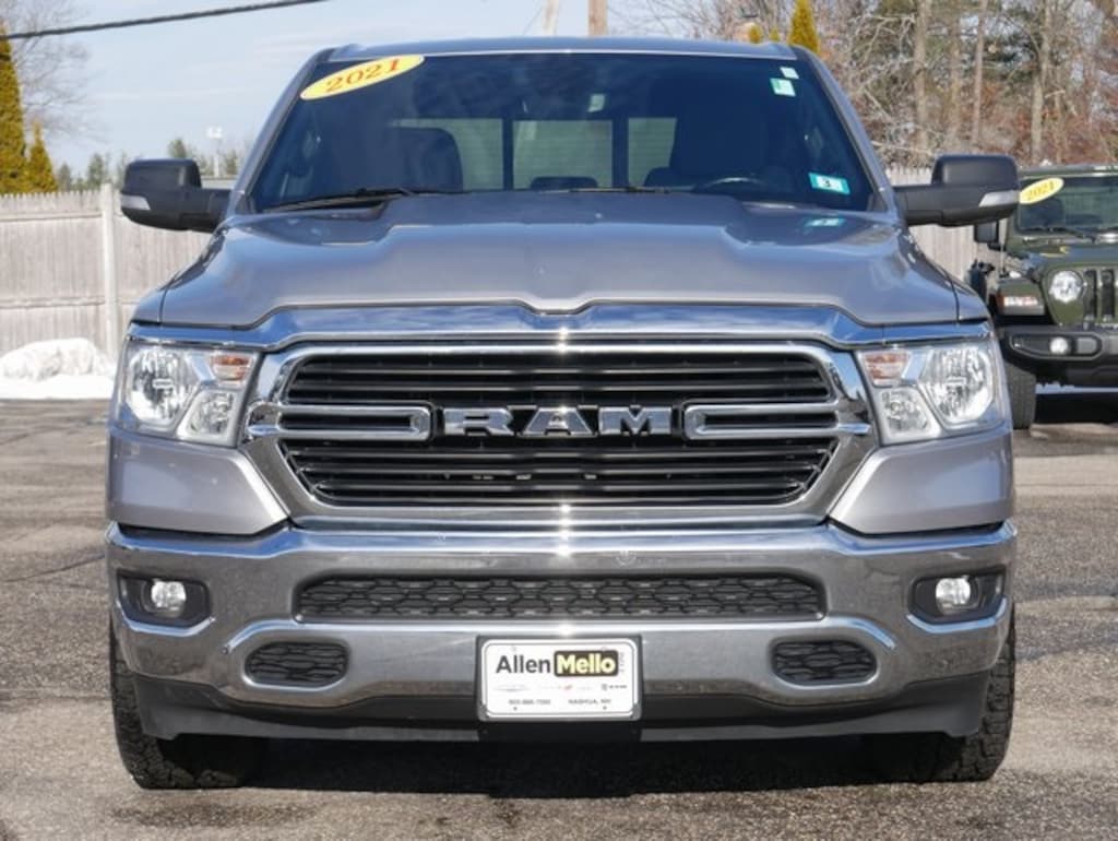 Allen Mello Chrysler Jeep Dodge Ram is proud to present you with another True Market Priced Pre-Owned Vehicle. This 2021 Ram 1500 Big Horn/Lone Star is loaded with the following Factory Options: Big Horn Level 1 Equipment Group (Radio: Uconnect 4 w/8.4" Display), Quick Order Package 27Z Big Horn, 3 Rear Seat Head Restraints, 4 Way Front Headrests, 4-Wheel Disc Brakes, 40/20/40 Split Bench Seat, 48V Belt Starter Generator, 6 Speakers, ABS brakes, Air Conditioning, Alloy wheels, AM/FM radio, Black Exterior Mirrors, Brake assist, Bumpers: chrome, Cloth Bench Seat, Compass, Delay-off headlights, Driver door bin, Dual front impact airbags, Dual front side impact airbags, Electronic Stability Control, Front anti-roll bar, Front Center Armrest w/Storage, Front fog lights, Front License Plate Bracket, Front reading lights, Front Seat Back Map Pockets, Front wheel independent suspension, Fully automatic headlights, GPS Antenna Input, Heated door mirrors, Illuminated entry, Integrated Voice Command w/Bluetooth, Leather steering wheel, Low tire pressure warning, Manufacturer's Statement of Origin, MOPAR Front & Rear Rubber Floor Mats, Occupant sensing airbag, Outside temperature display, Overhead airbag, Overhead console, Panic alarm, ParkView Rear Back-Up Camera, Passenger door bin, Passenger vanity mirror, Power door mirrors, Power steering, Power windows, Radio data system, Radio: Uconnect 3 w/5" Display, Rear 60/40 Folding Seat, Rear anti-roll bar, Rear seat center armrest, Rear step bumper, Remote keyless entry, Remote Start System, Speed control, Split folding rear seat, Steering wheel mounted audio controls, Tachometer, Telescoping steering wheel, Tilt steering wheel, Traction control, Trailer Brake Control, Trip computer, Variably intermittent wipers, Voltmeter, Wheels: 18" x 8" Cast-Aluminum Painted, and Wheels: 20" x 9" Aluminum Chrome Clad (WRK)!!
