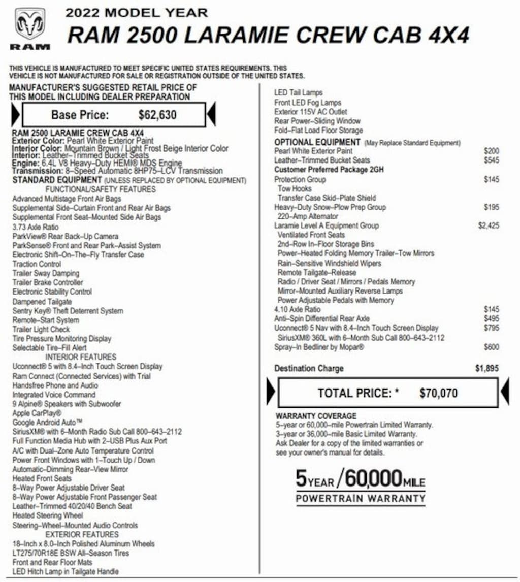 Allen Mello Chrysler Jeep Dodge Ram is proud to present you with another True Market Priced Pre-Owned Vehicle. This 2022 Ram 2500 Laramie is loaded with the following Factory Options: Heavy Duty Snow Plow Prep Group (220 Amp Alternator), Laramie Level An Equipment Group (2nd Row In Floor Storage Bins, Auto High Beam Headlamp Control, Chrome Exterior Mirrors, Exterior Mirrors Courtesy Lamps, Exterior Mirrors w/Heating Element, Exterior Mirrors w/Memory, Exterior Mirrors w/Supplemental Signals, Foam Bottle Insert (Door Trim Panel), Mirror Running Lights, Mirror-Mounted Aux Reverse Lamps, Power Adjustable Convex Aux Mirrors, Power Adjustable Pedals w/Memory, Power Chrome Tow Mirrors w/Convex Spotter & Memory, Power Folding Mirrors, Radio/Driver Seat/Mirrors/Pedals Memory, Rain Sensitive Windshield Wipers, Remote Tailgate Release, and Trailer Tow Mirrors), Protection Group, Quick Order Package 2GH Laramie, 4.10 Axle Ratio, Anti-Spin Differential Rear Axle, and Tow Hooks Heavy Duty Snow Plow Prep Group (220 Amp Alternator), Laramie Level An Equipment Group (2nd Row In Floor Storage Bins, Auto High Beam Headlamp Control, Chrome Exterior Mirrors, Exterior Mirrors Courtesy Lamps, Exterior Mirrors w/Heating Element, Exterior Mirrors w/Memory, Exterior Mirrors w/Supplemental Signals, Foam Bottle Insert (Door Trim Panel), Mirror Running Lights, Mirror-Mounted Aux Reverse Lamps, Power Adjustable Convex Aux Mirrors, Power Adjustable Pedals w/Memory, Power Chrome Tow Mirrors w/Convex Spotter & Memory, Power Folding Mirrors, Radio/Driver Seat/Mirrors/Pedals Memory, Rain Sensitive Windshield Wipers, Remote Tailgate Release, and Trailer Tow Mirrors), Protection Group, Quick Order Package 2GH Laramie, 4.10 Axle Ratio, Anti-Spin Differential Rear Axle, Tow Hooks, 10 Speakers, 115V Auxiliary Rear Power Outlet, 2 Way Rear Headrest Seat, 4 Way Front Headrests, 4-Wheel Disc Brakes, 4G LTE Wi-Fi Hot Spot, 8.4" Touchscreen Display, ABS brakes, Active Noise Control System, Adjustable pedals, Air Conditioning, Alexa Built-In, All R1 High Radios, All Radio Equipped Vehicles, Alloy wheels, AM/FM radio: SiriusXM, Apple CarPlay, Apple CarPlay/Android Auto, Auto-dimming Rear-View mirror, Automatic temperature control, Bluetooth Handsfree Phone & Audio, Brake assist, Bumpers: chrome, Compass, Connected Travel & Traffic Services, Connectivity - US/Canada, Delay-off headlights, Disassociated Touchscreen Display, Driver door bin, Driver vanity mirror, Dual front impact airbags, Dual front side impact airbags, Electronic Stability Control, Electronically Controlled Throttle, For Details