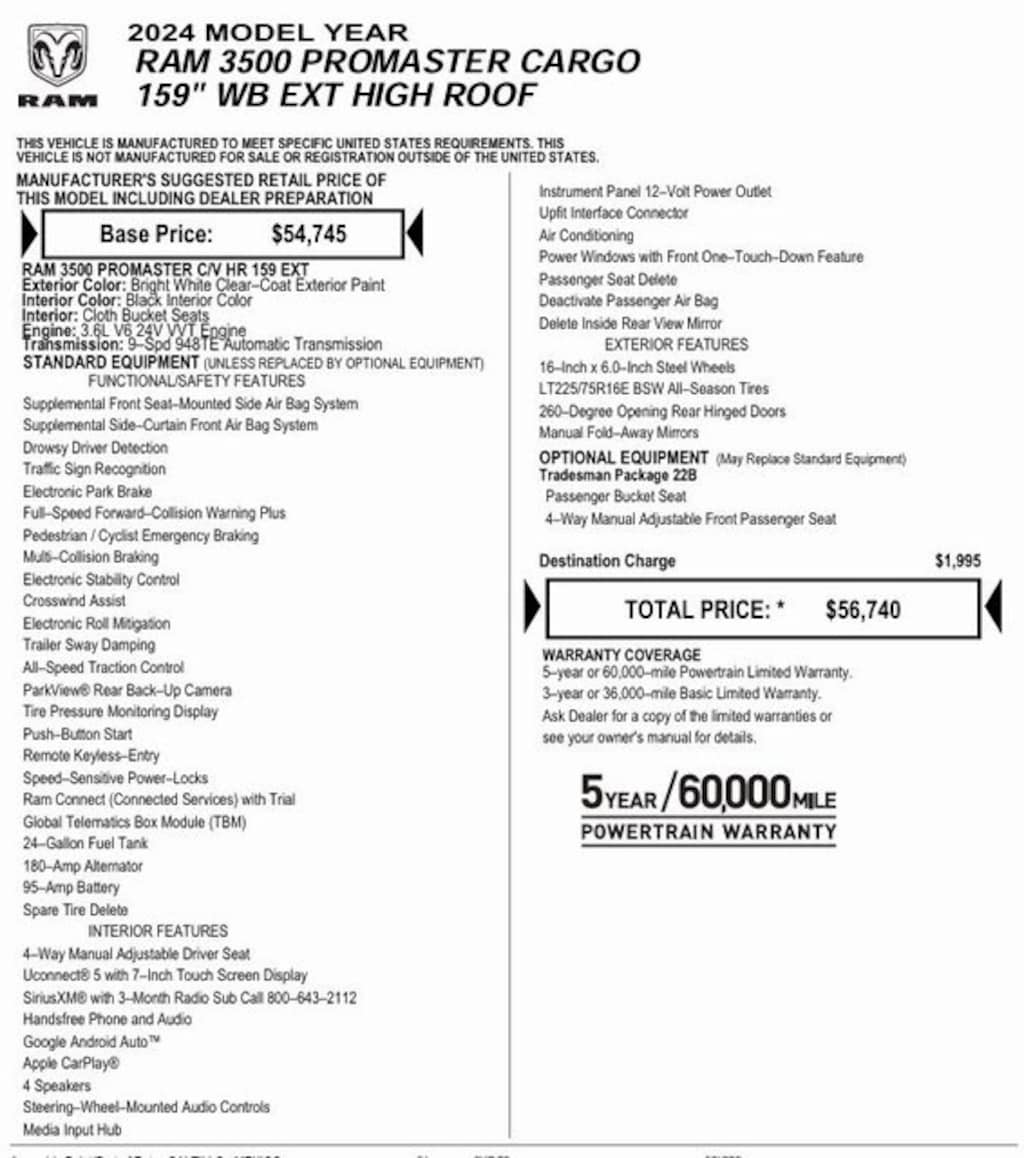 Allen Mello Chrysler Jeep Dodge Ram is proud to present you with another True Market Priced Pre-Owned Vehicle. This 2024 Ram ProMaster 3500 High Roof is loaded with the following Factory Options: Quick Order Package 22B Tradesman w/Pass Seat (4-Way Manual Adjust Front Passenger Seat and Passenger Bucket Seat), 4 Speakers, 4.08 Axle Ratio, Air Conditioning, AM/FM radio: SiriusXM, Heavy Duty Suspension, ParkView Rear Back-Up Camera, Power steering, Power windows, Radio: Uconnect 5 w/7" Display, Remote keyless entry, Wheel Center Cap, and Wheels: 16" x 6.0" Steel Quick Order Package 22B Tradesman w/Pass Seat (4-Way Manual Adjust Front Passenger Seat and Passenger Bucket Seat), 4 Speakers, 4.08 Axle Ratio, Air Conditioning, AM/FM radio: SiriusXM, Heavy Duty Suspension, ParkView Rear Back-Up Camera, Power steering, Power windows, Radio: Uconnect 5 w/7" Display, Remote keyless entry, Wheel Center Cap, Wheels: 16" x 6.0" Steel, 4-Wheel Disc Brakes, ABS brakes, Apple CarPlay/Android Auto, Black/Gray Seats, Bodyside moldings, Brake assist, Cloth Bucket Seats, Driver door bin, Driver Seat Armrest, Driver's Seat Mounted Armrest, Electronic Stability Control, Exterior Mirrors w/Supplemental Signals, Front anti-roll bar, Front Bucket Seats, Front License Plate Bracket, Front reading lights, Front wheel independent suspension, Illuminated entry, Low tire pressure warning, Manufacturer's Statement of Origin, Outside temperature display, Overhead airbag, Overhead console, Passenger door bin, Rear anti-roll bar, Steering wheel mounted audio controls, Tachometer, Telescoping steering wheel, Traction control, Trip computer, Turn signal indicator mirrors, and Variably intermittent wipers!!